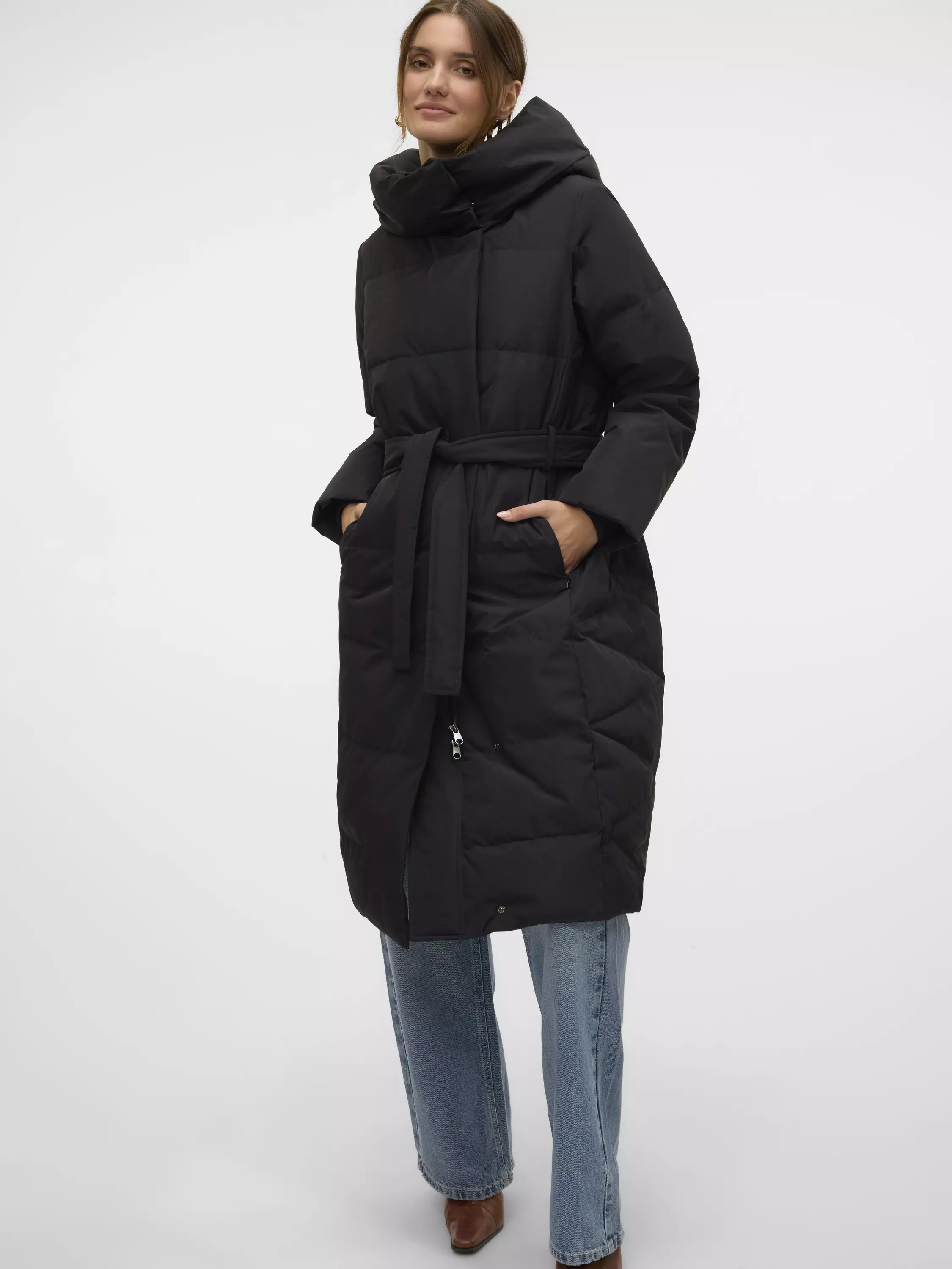 Pitkä hupullinen untuvatakki, jossa on vyö. Takissa on kaunis leikkaus. Hihansuissa on resorit ja vetoketjun päällä tuulilista. Takissa on todella kaunis kunnon huppu.
