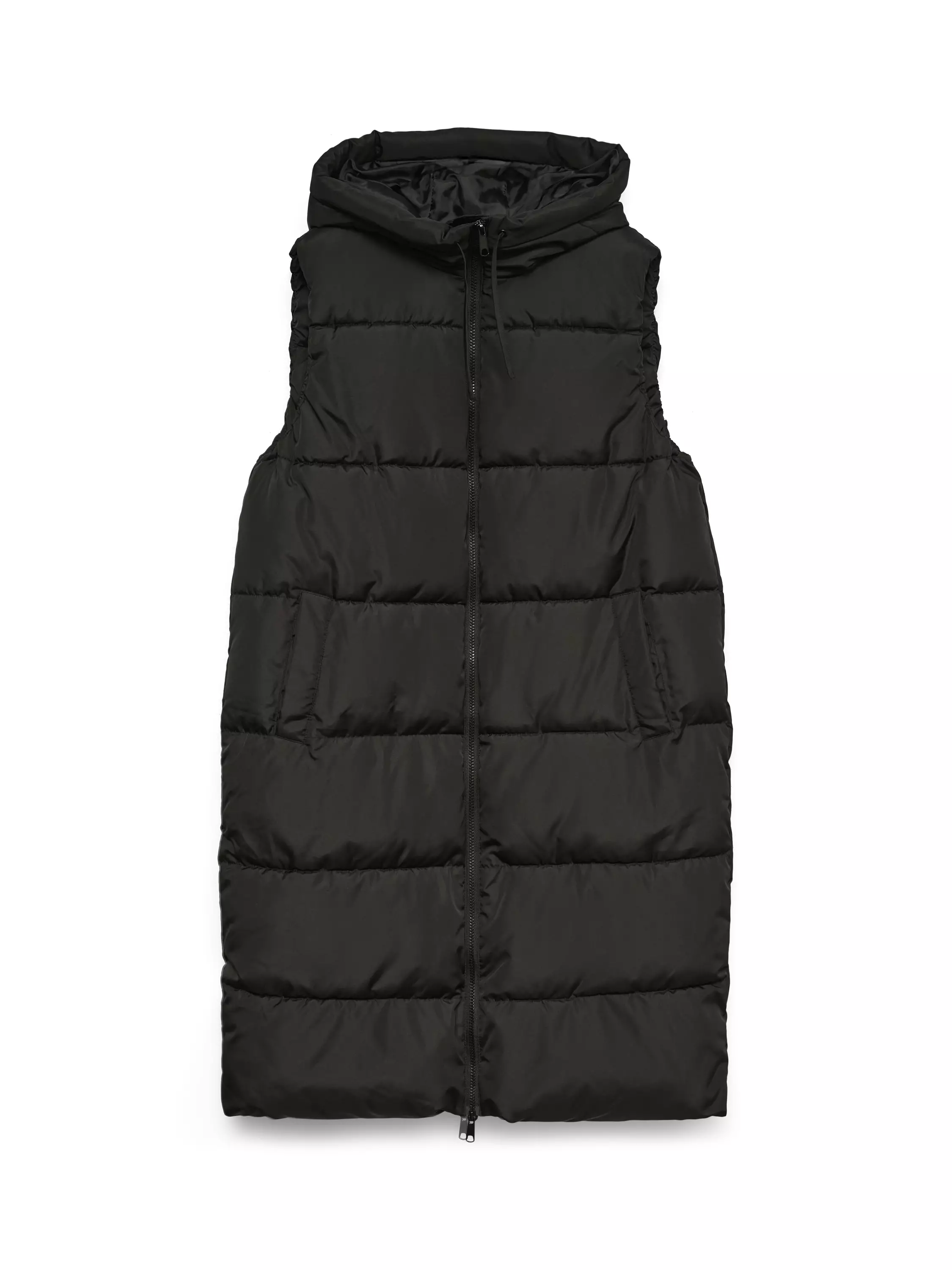 Pohjemittainen toppaliivi, jossa on huppu ja edessä kaksi avotaskua.