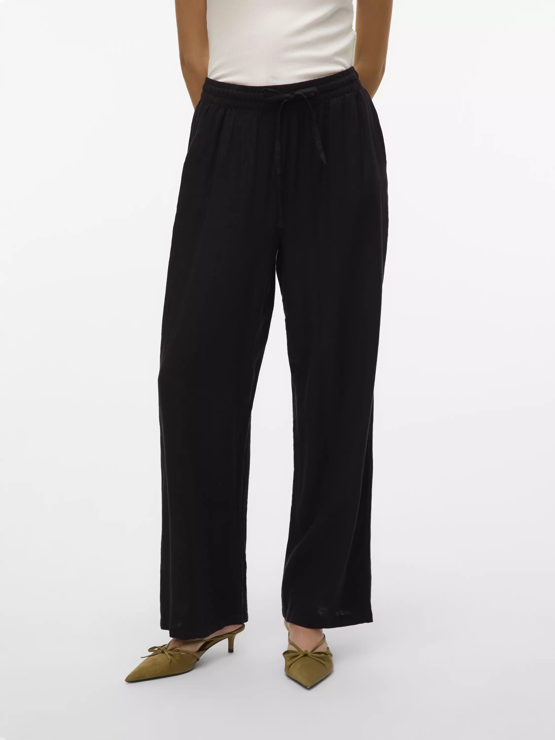 Suoralahkeiset pellavahousut, joissa on vyötäröllä kiristysmahdollisuus ja edessä kaksi avotaskua.
