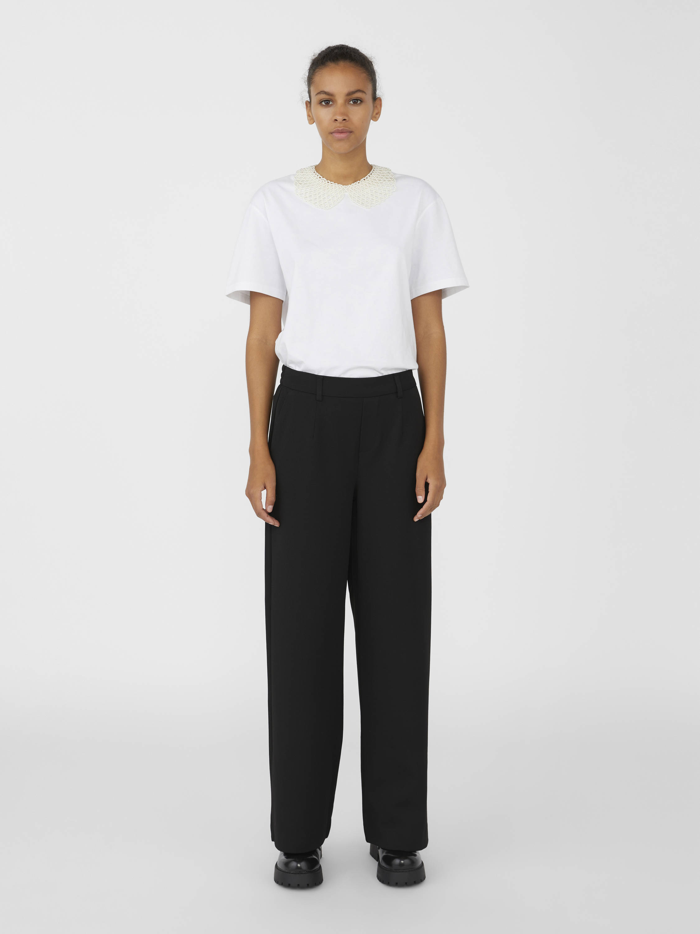 Leveät ja normaalivyötäröiset housut. Kuminauhavyötärö, jossa on vyölenkit.