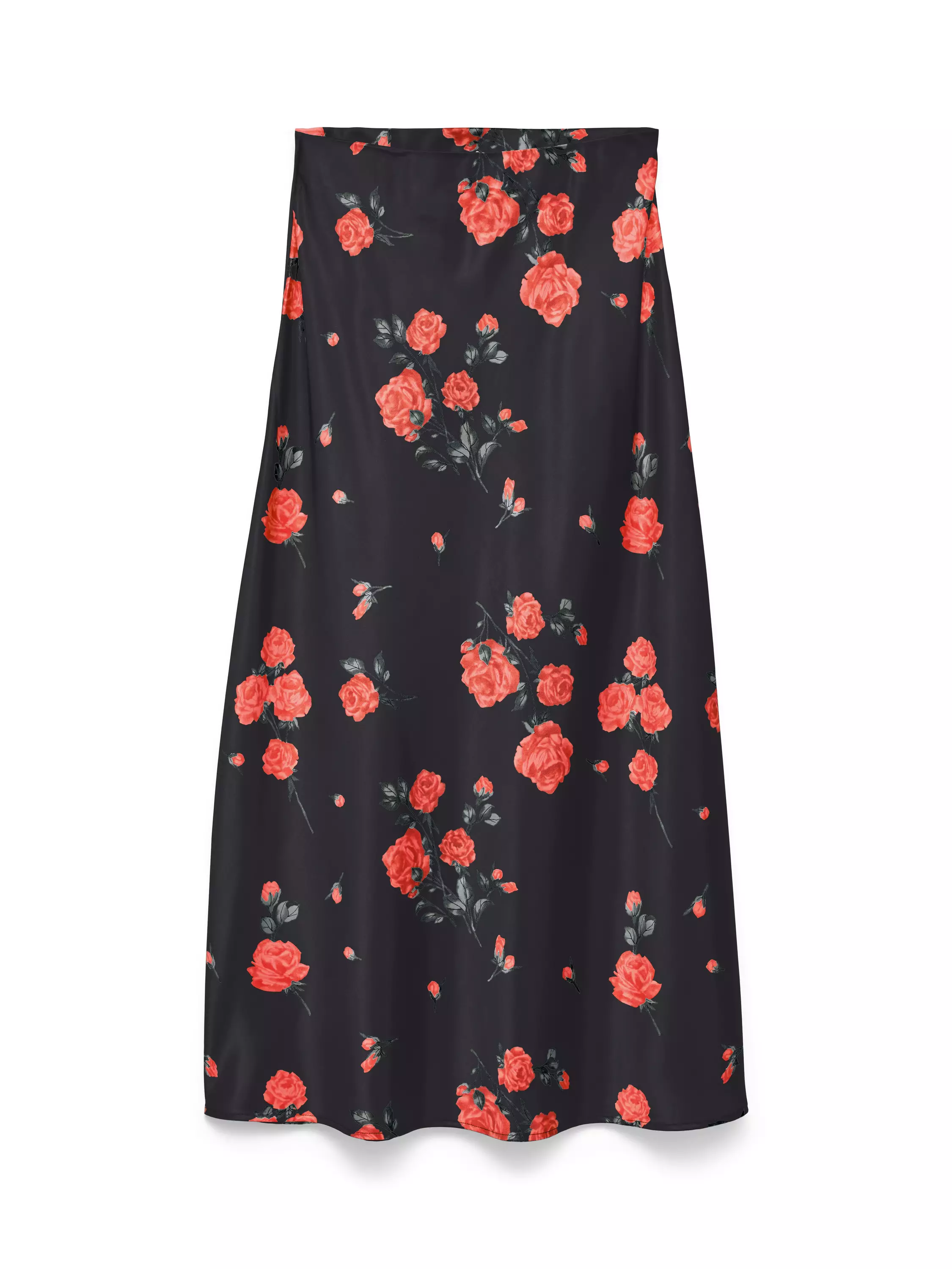 Korkeavyötäröinen pitkä satiinihame, jossa on levenevä helma.