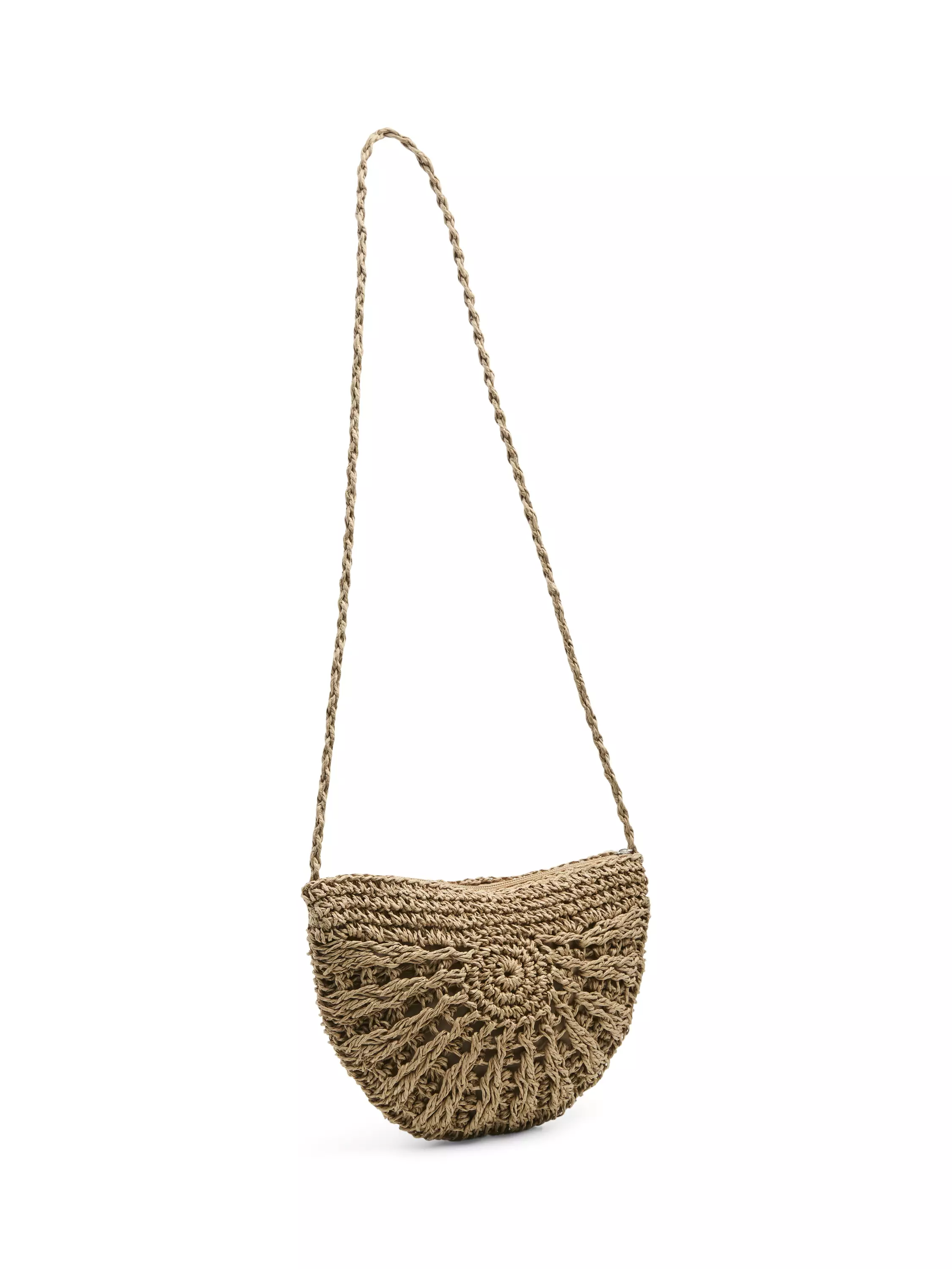 Puolikuun mallinen paperinarulaukku. Koerkeus: 18 cm, leveys 25 cm, syvyys: 1cm Laukussa on olkahihna ja laukun voi sulkea vetoketjulla.