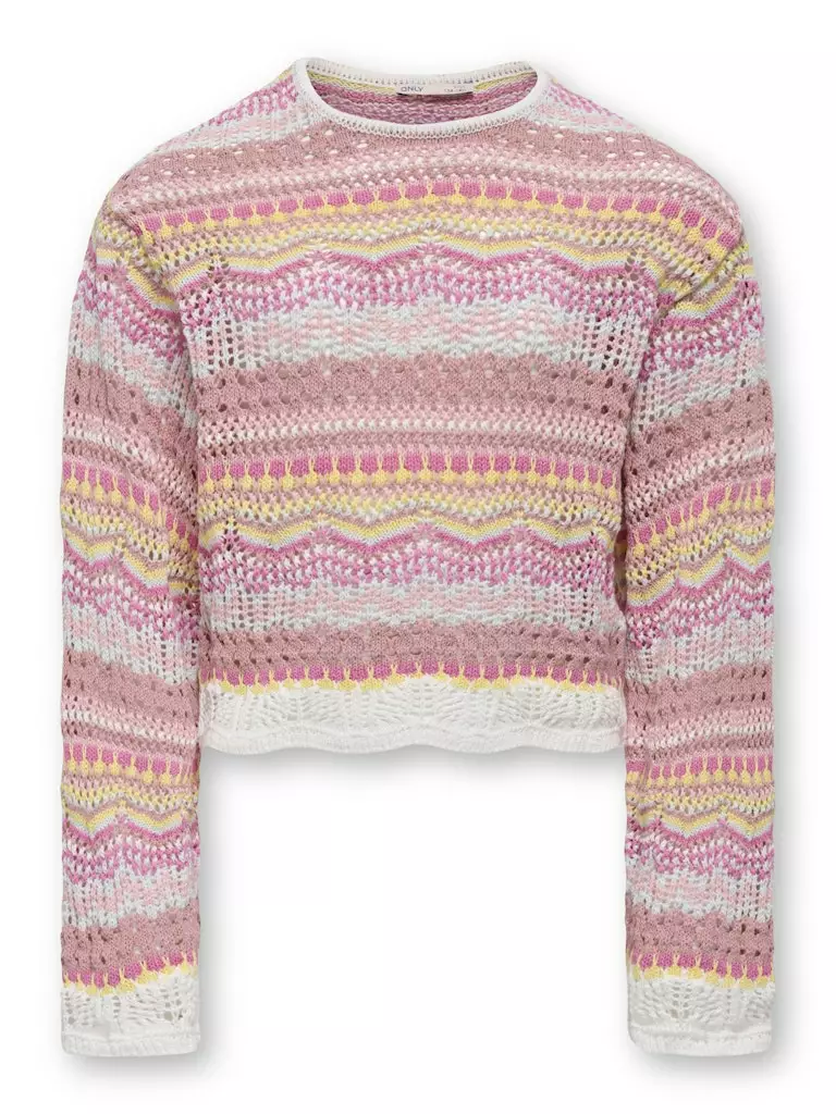 Neulepaita, jossa on pyöreä pääntie. Neuleessa on kiva kevyt materiaali ja kauniit värit.
