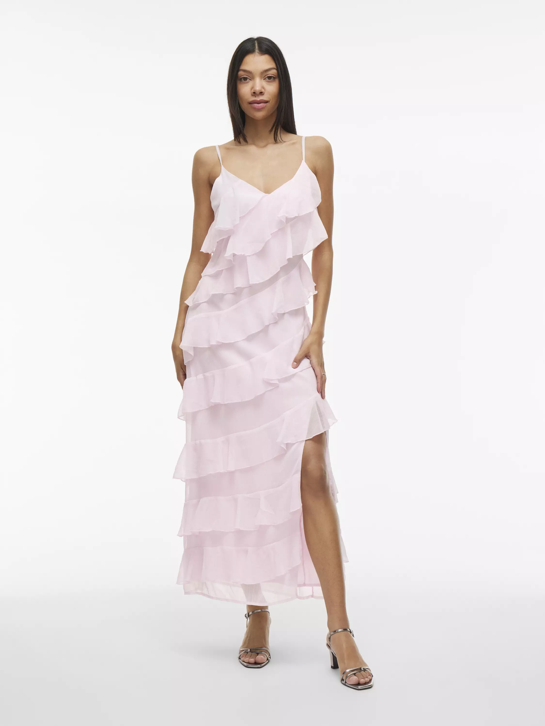 Pitkä vuorillinen röyhelömekko, jossa on ohuet säädettävät olkaimet. Mekossa on kaunis avonainen yläosa. Sivussa oleva vetoketju helpottaa pukemista. Helmassa on halkio vasemmalla puolella.