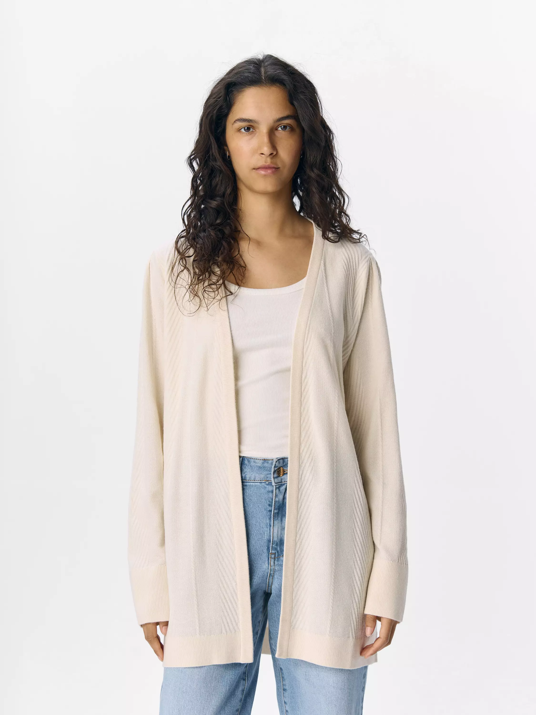 Puolipitkä neuletakki, jossa on kaunis elävä palmikkomainen neulos.