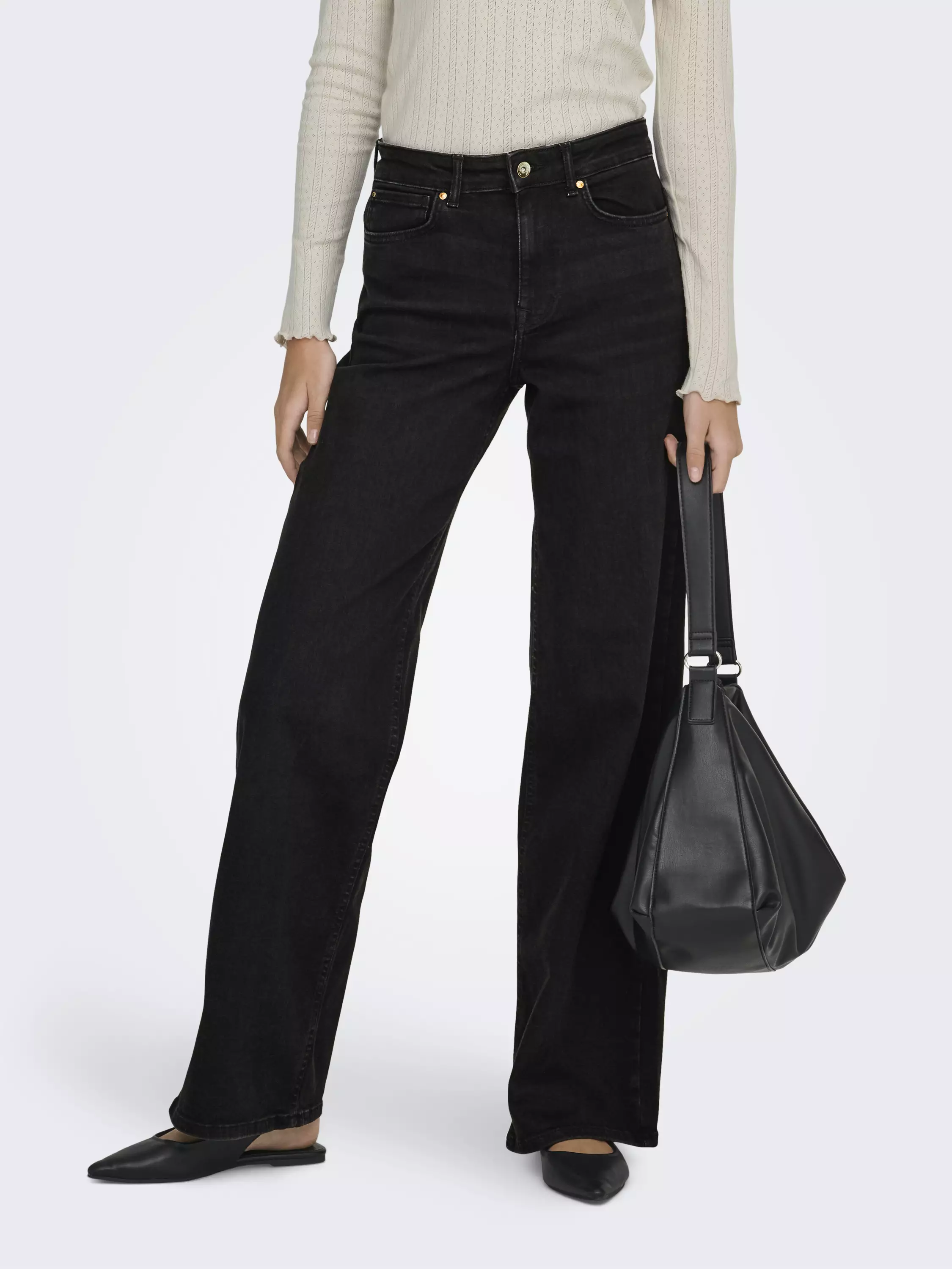 Korkeavyötäröiset leveälahkeiset farkut, joissa on todella joustava materiaali.