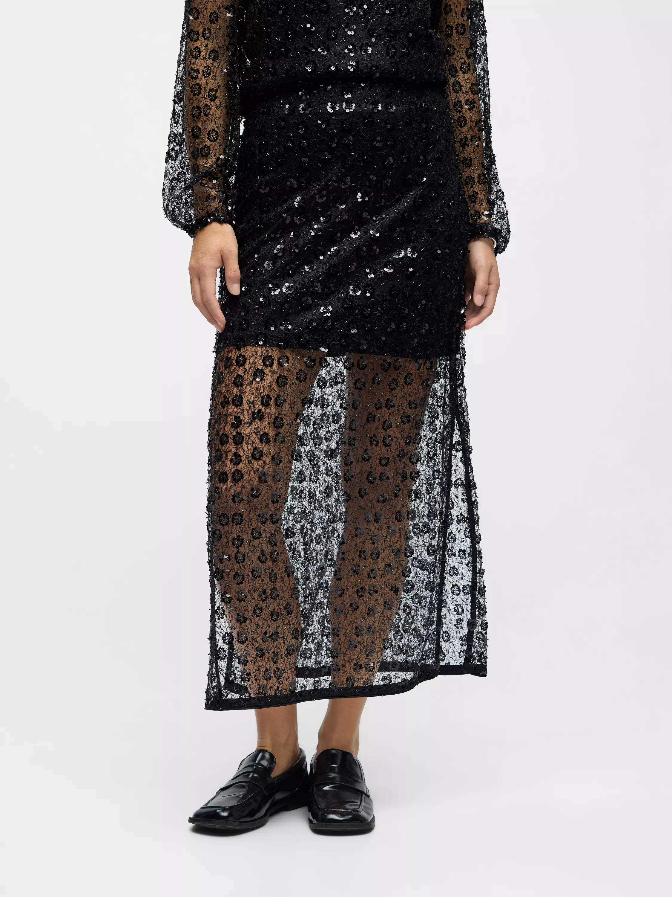 Pitkä hame, jossa on korkea vyötärö. Hameessa on lyhyempi alushame, jonka ansiosta kankaan kaunis elävä pinta pääsee oikeuksiinsa. Hameen pinnalla on kauniita paljetteja ja molemmilta sivuilta löytyvät halkiot. Hameen sivussa yläosassa on vetoketju, joka helpottaa pukemista.