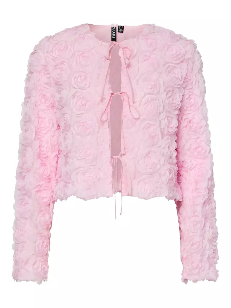 Vuorillinen jakku, jossa on kauniita ruususomisteita. Edessä on solmittavat narut.