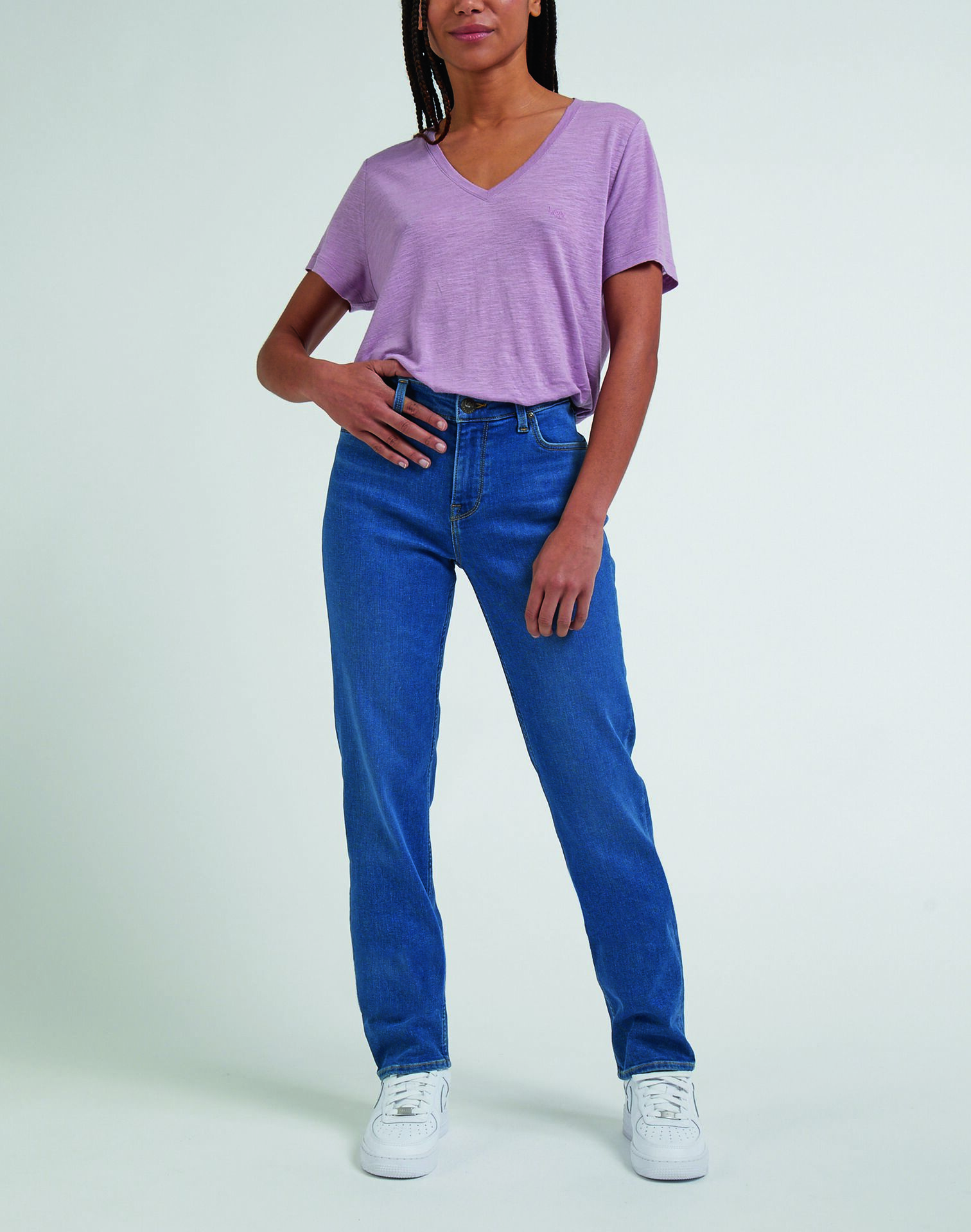 Suorat farkut, joissa keskikorkeavyötärö ja kaunis keskisininen pesu.
