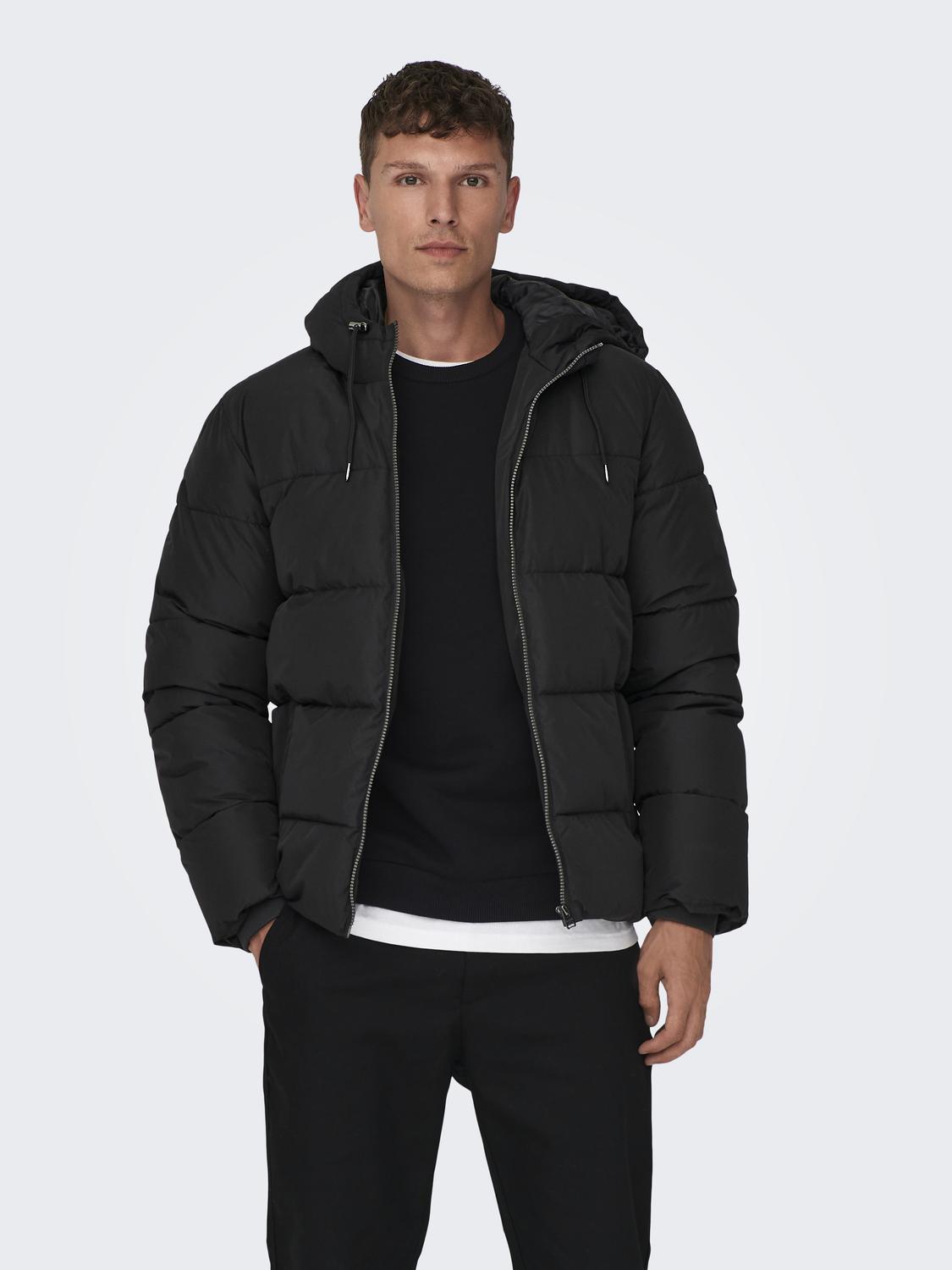 Puffer-takki, jossa on edessä napilliset taskut. Takissa on povitasku sekä hupussa on kiristysmahdollisuus.