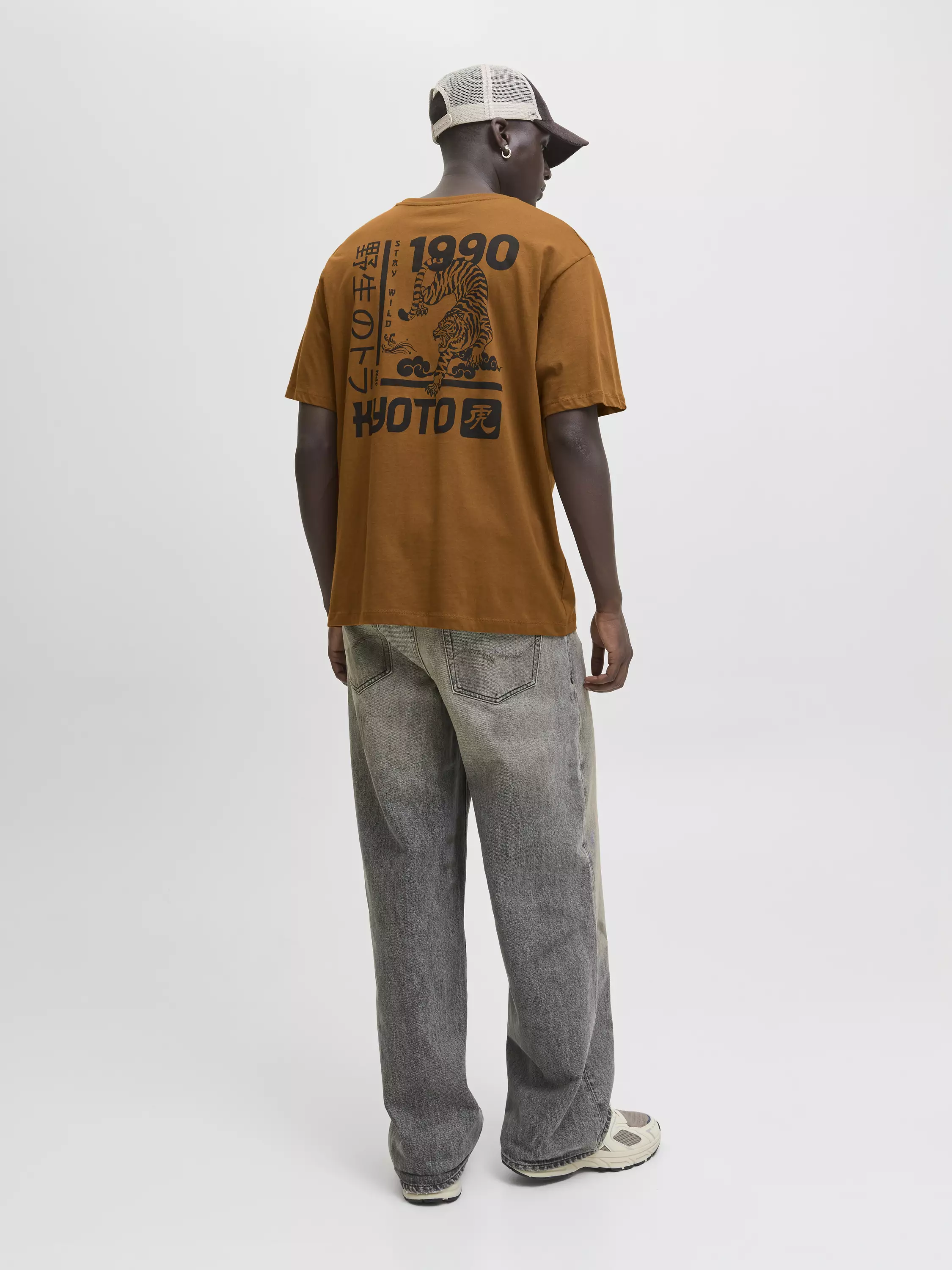 T-paita, jossa on iso kuviopainatus selässä.