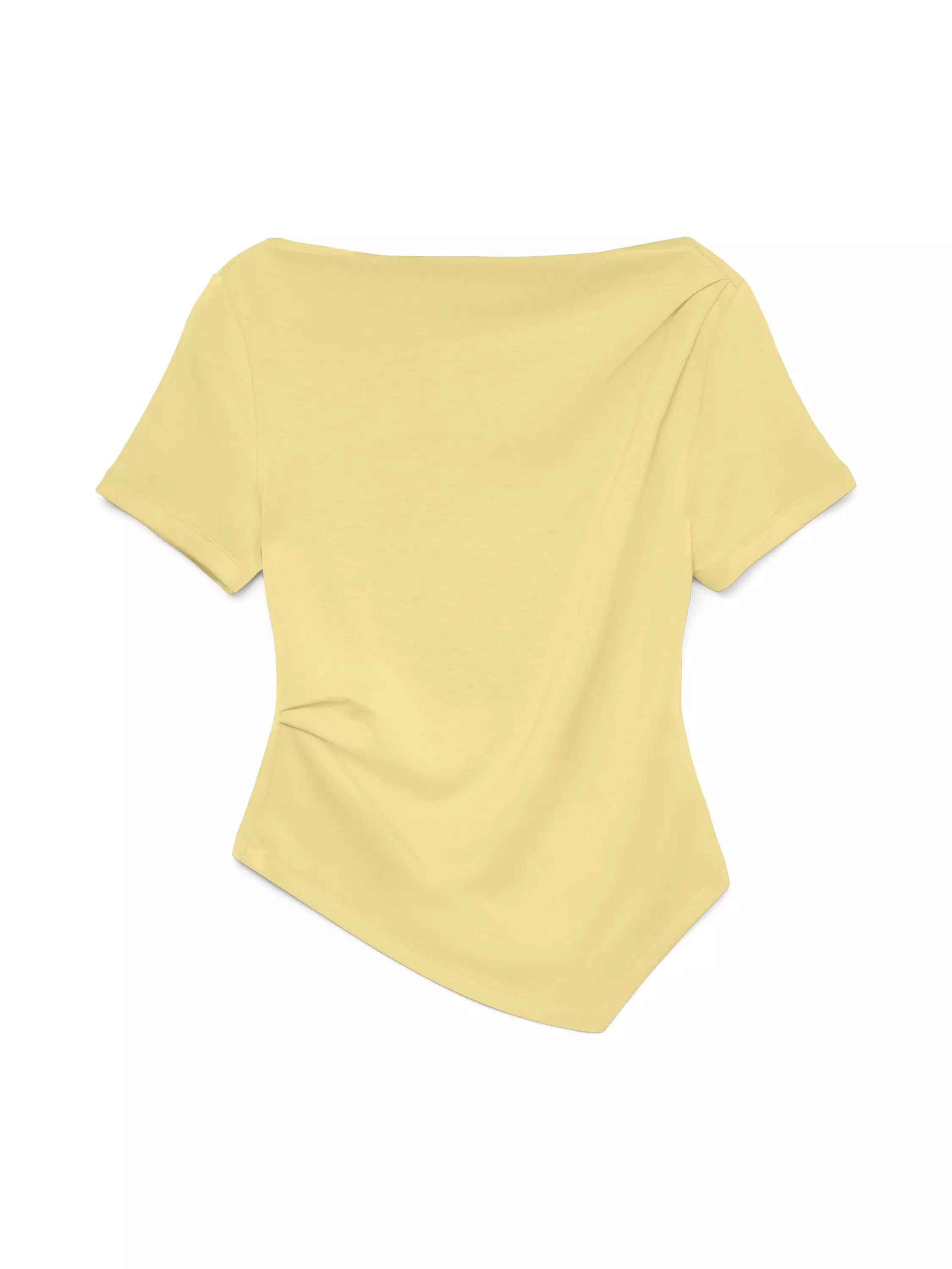 Lyhythihainen trikoopaita, jossa on venepääntie. Olkapäällä ja sivulla on rypytyslaskokset. Paidassa on kaunis epäsymmetrinen helma. Paidassa on mukava pehmoinen materiaali.