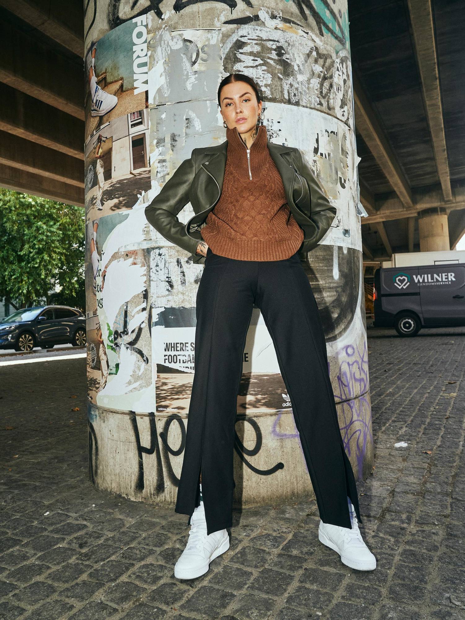 Korkeavyötäröiset ja leveälahkeiset housut. Lahkeensuissa pienet halkiot edessä. Joustava kangas.