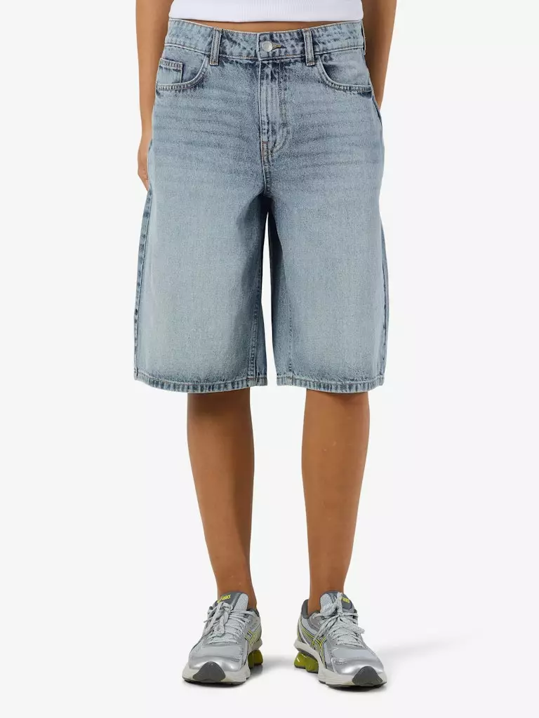Polvimittaiset loose-malliset farkkushortsit, joissa on keskikorkea vyötärö.