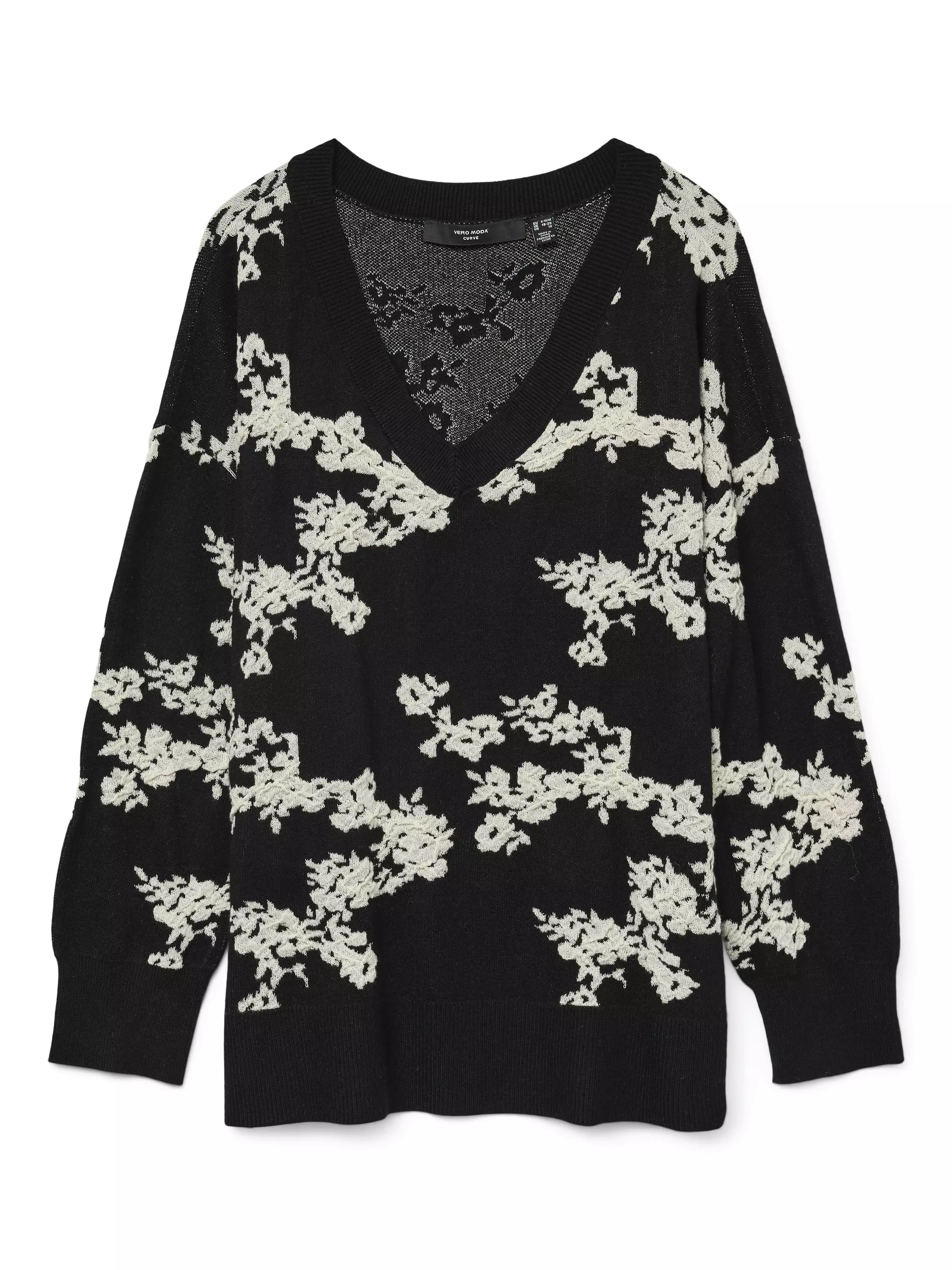 Pitkänmallinen neule, jossa on kauniita yksityiskohtia ja v-pääntie.