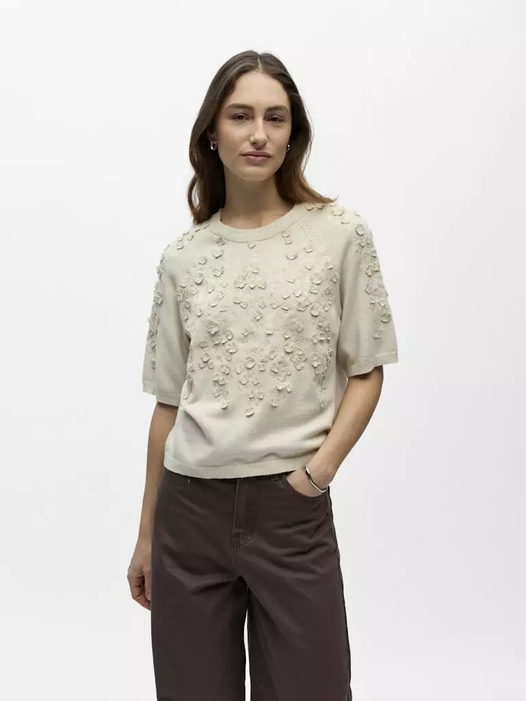 Lyhythihainen neulepaita, jossa on niskassa solmittava nauha. Neuleen pinnassa on brodeerattuja kukkia.