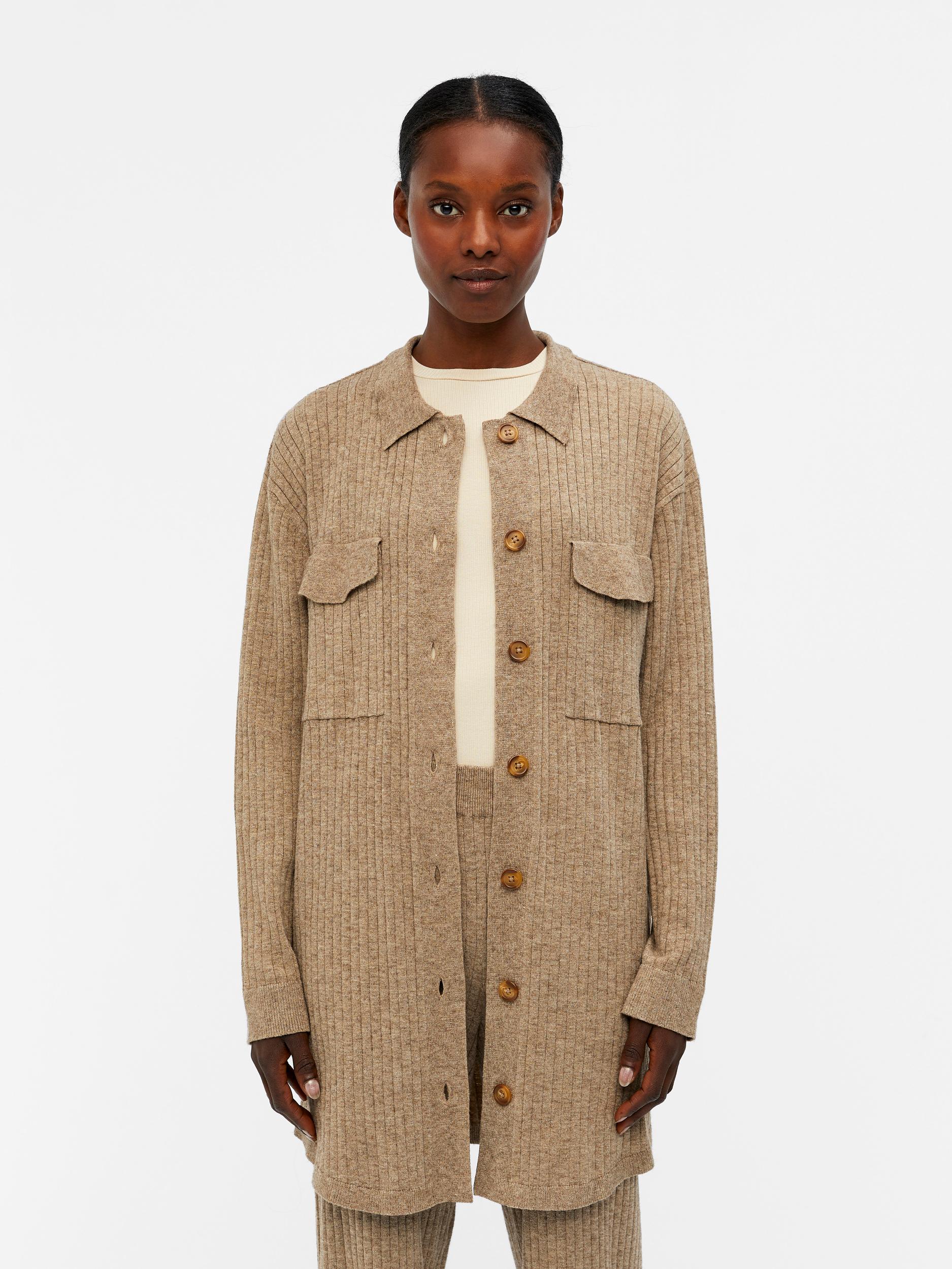 Kauluksellinen neulepusero, jossa on edessä nappikiinnitys. Edessä on rintataskut.
