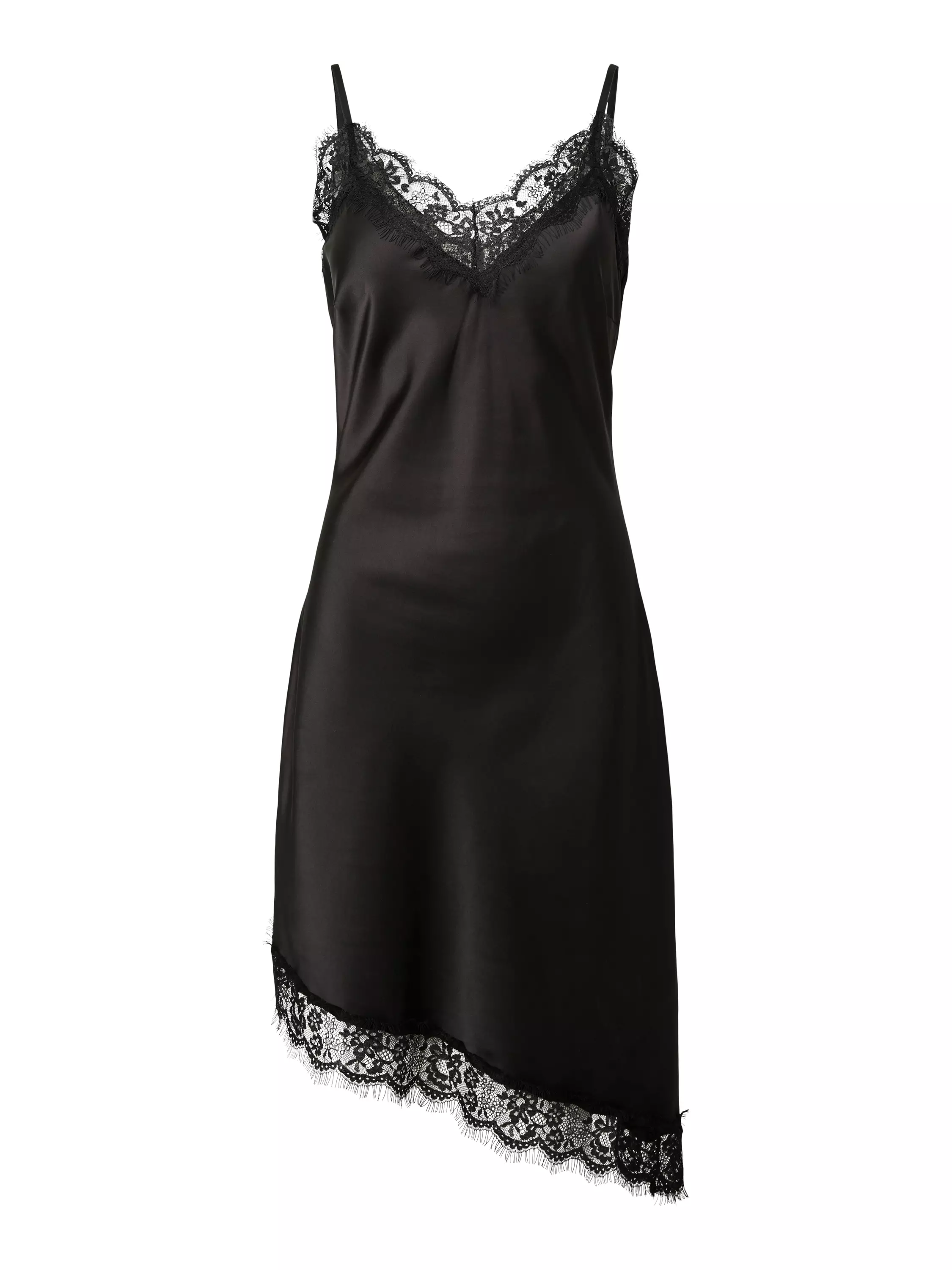 Kaunis satiinimekko, jossa on pitsiyksityiskohdat yläosassa sekä helmassa. Helma on leikattu epäsymmetrisesti ja mekon olkaimet ovat säädettävät.