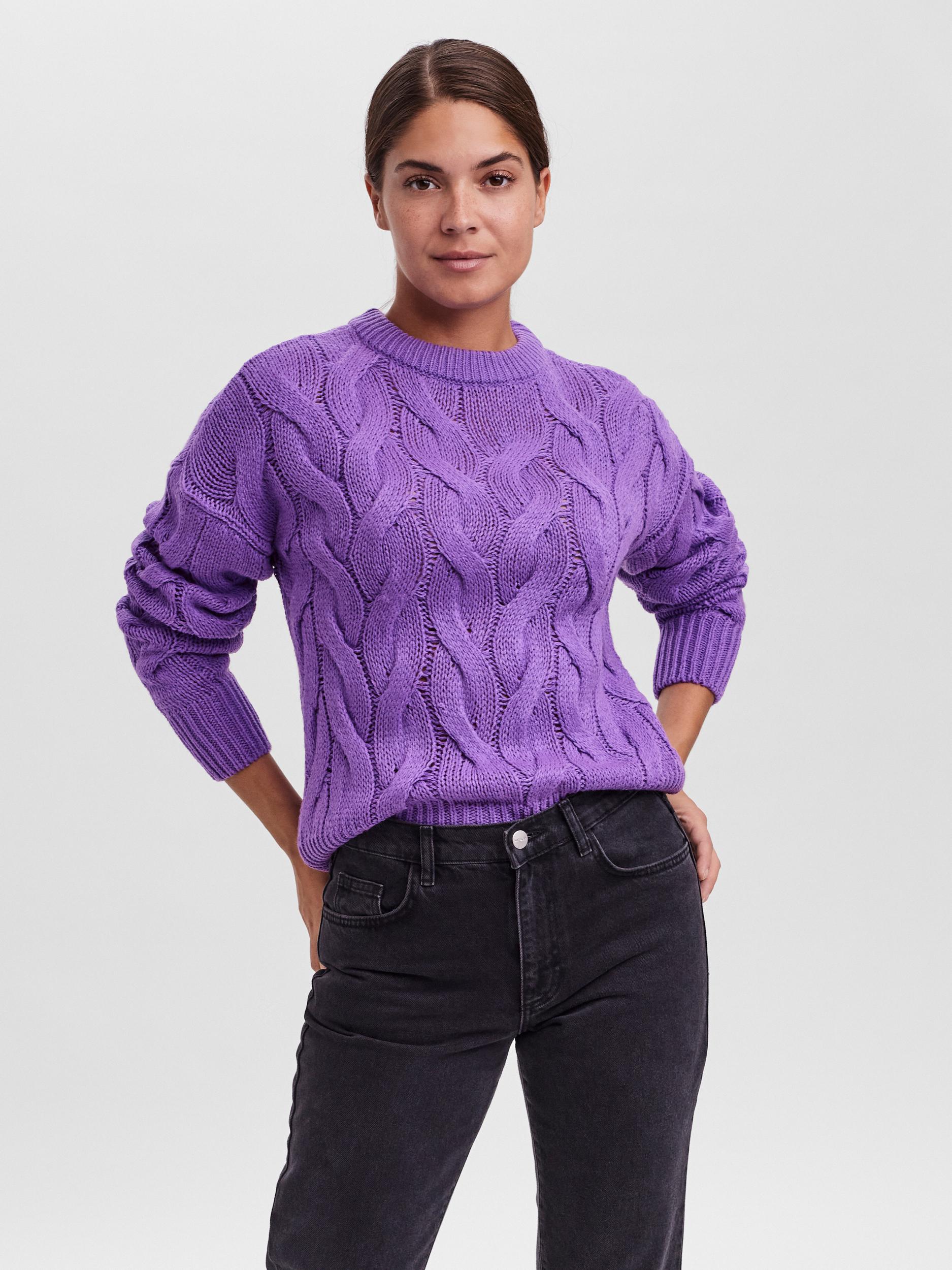 Kaunis palmikikoneulepusero, jossa on pyöreä pääntie.