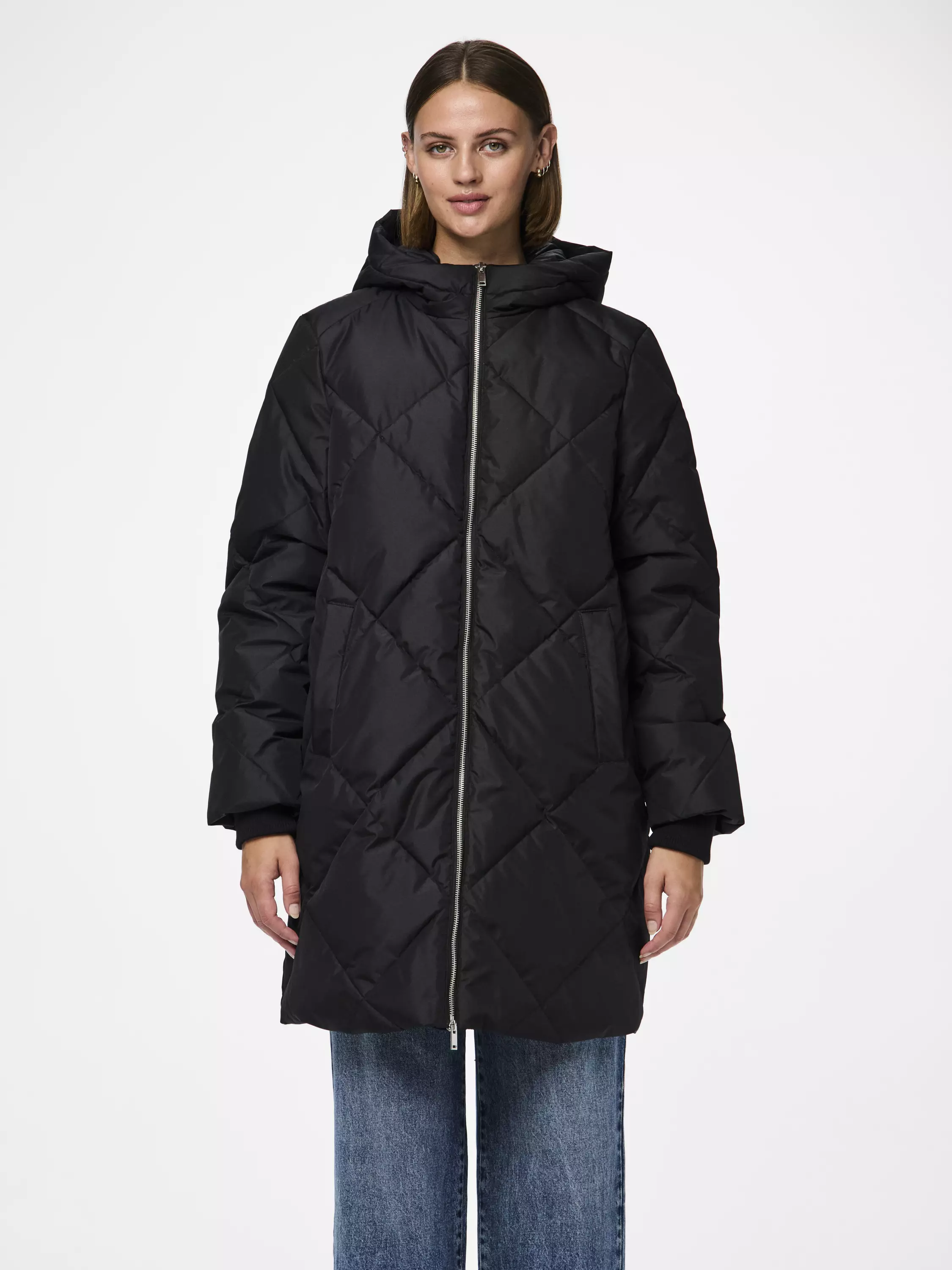 Puolipitkä untuvatakki, jossa on huppu ja edessä kaksipuoleinen vetoketju. Takissa on kaksi avotaskua edessä.