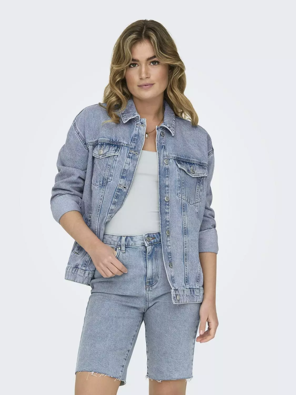 Oversize-mallinen farkkutakki. Takissa on kaksi rintataskua sekä kaksi valetaskua sivuilla. Takissa on kaulukset ja nappikiinnitys.