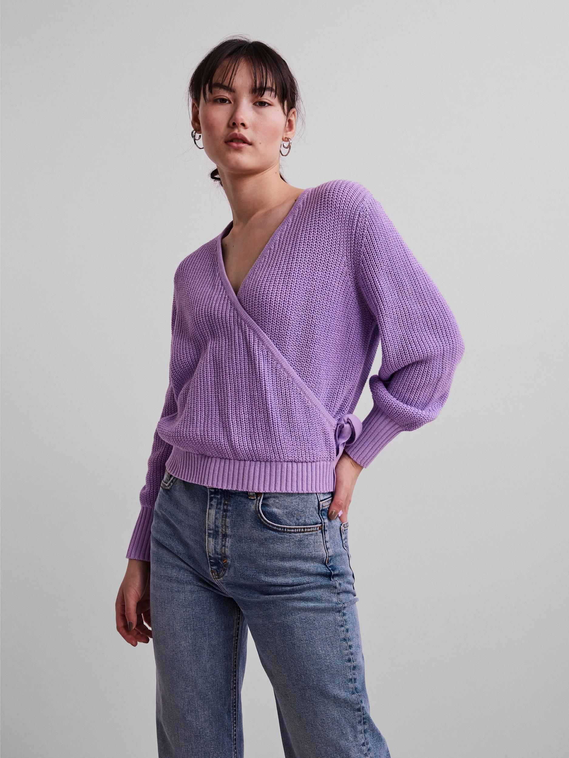 Kaunis kietaisumallinen neulepusero, jossa on rusetti sivulla.