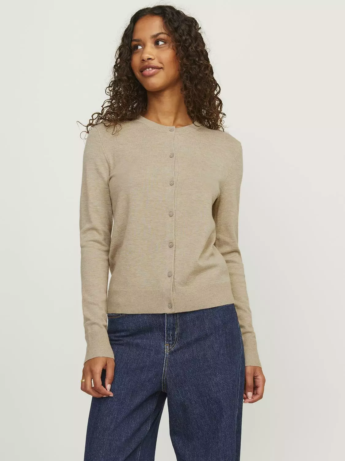 Pitkähihainen neuletakki, jossa on edessä nappikiinnitys.
