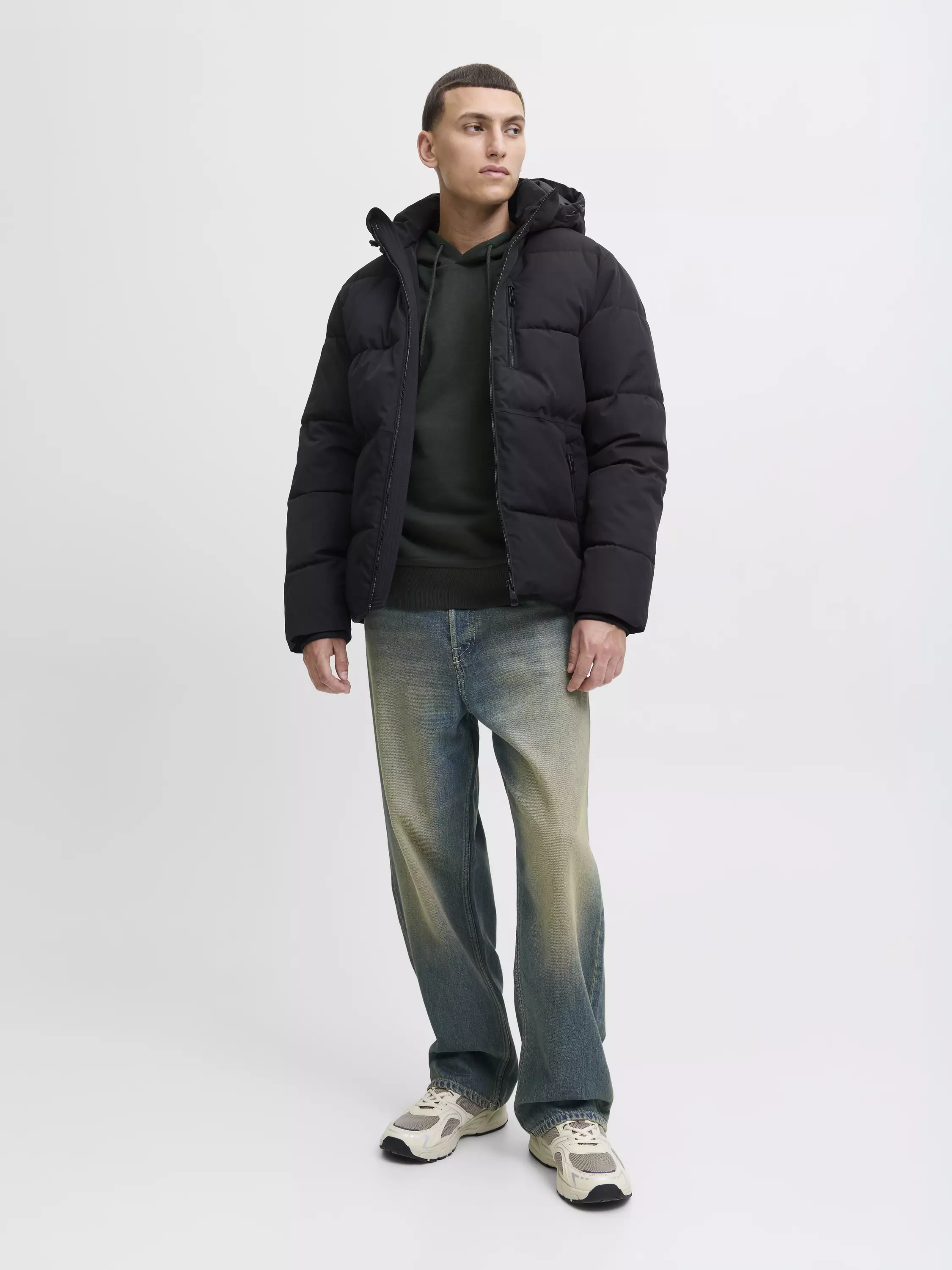 Hupullinen puffer-mallinen takki, jossa on vetoketjukiinnitys ja edessä on kaksi vetoketjullista taskua sekä rintatasku. Hupusta ja takin helmasta löytyy kiristysmahdollisuus. Huppu on irroitettava. Takista löytyy myös povitasku.