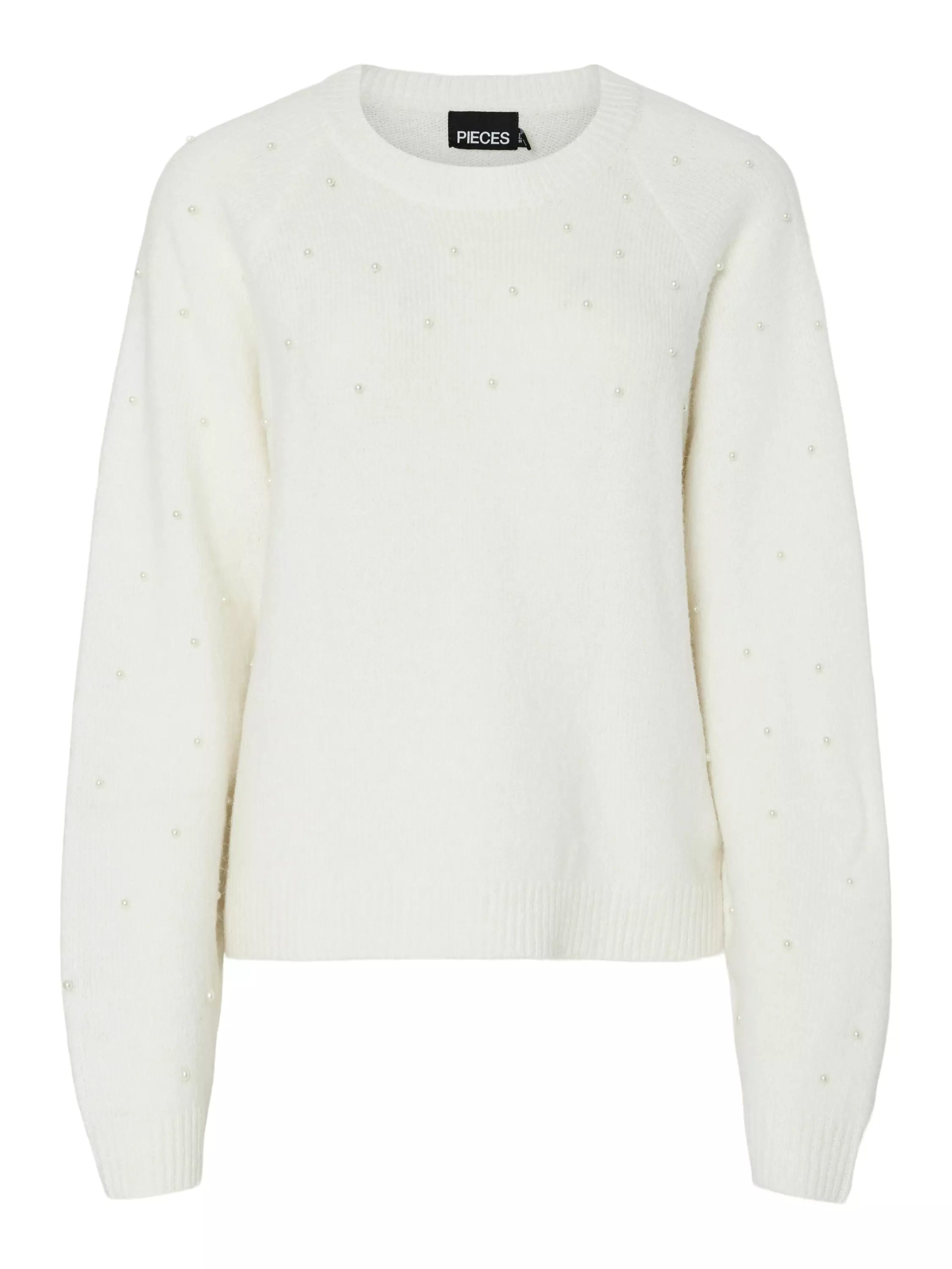 Kaunis oversize-mallinen neule, johon on kirjailtu helmiä.