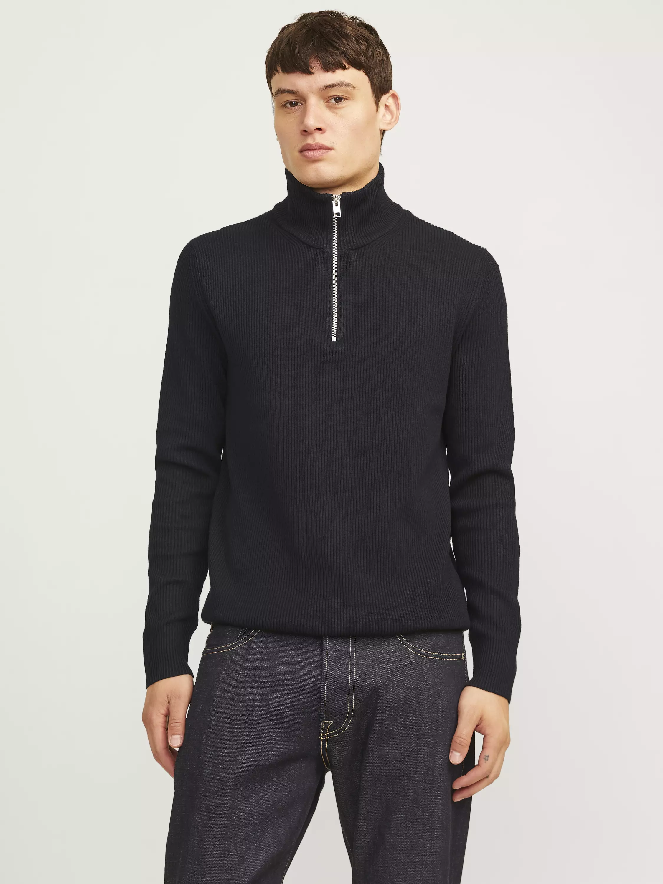Suoranmallinen neulepaita, jossa on kauluksessa vetoketju.
