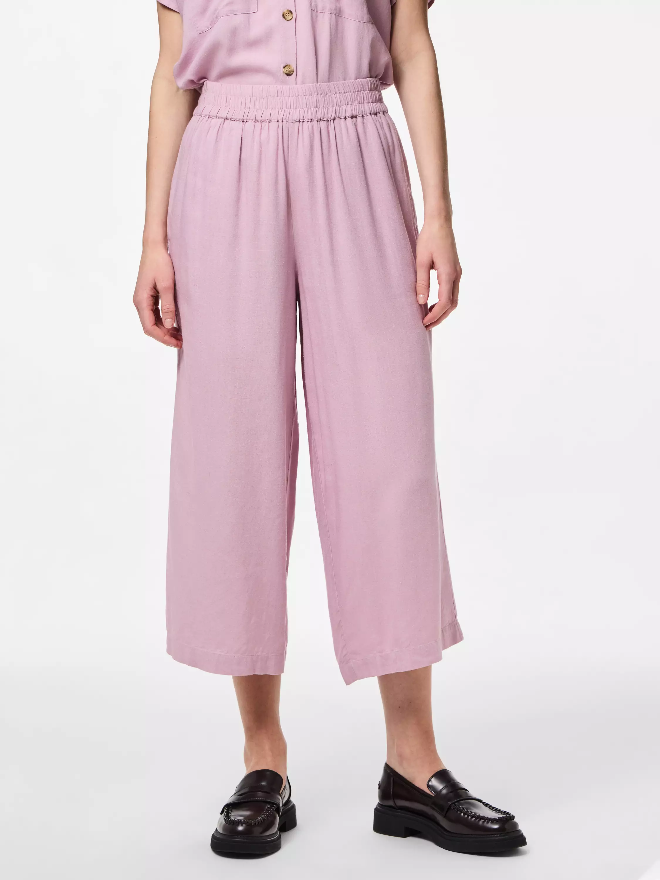 Leveät culotte-mittaiset housut, joissa on joustava korkea kuminauhavyötärö.