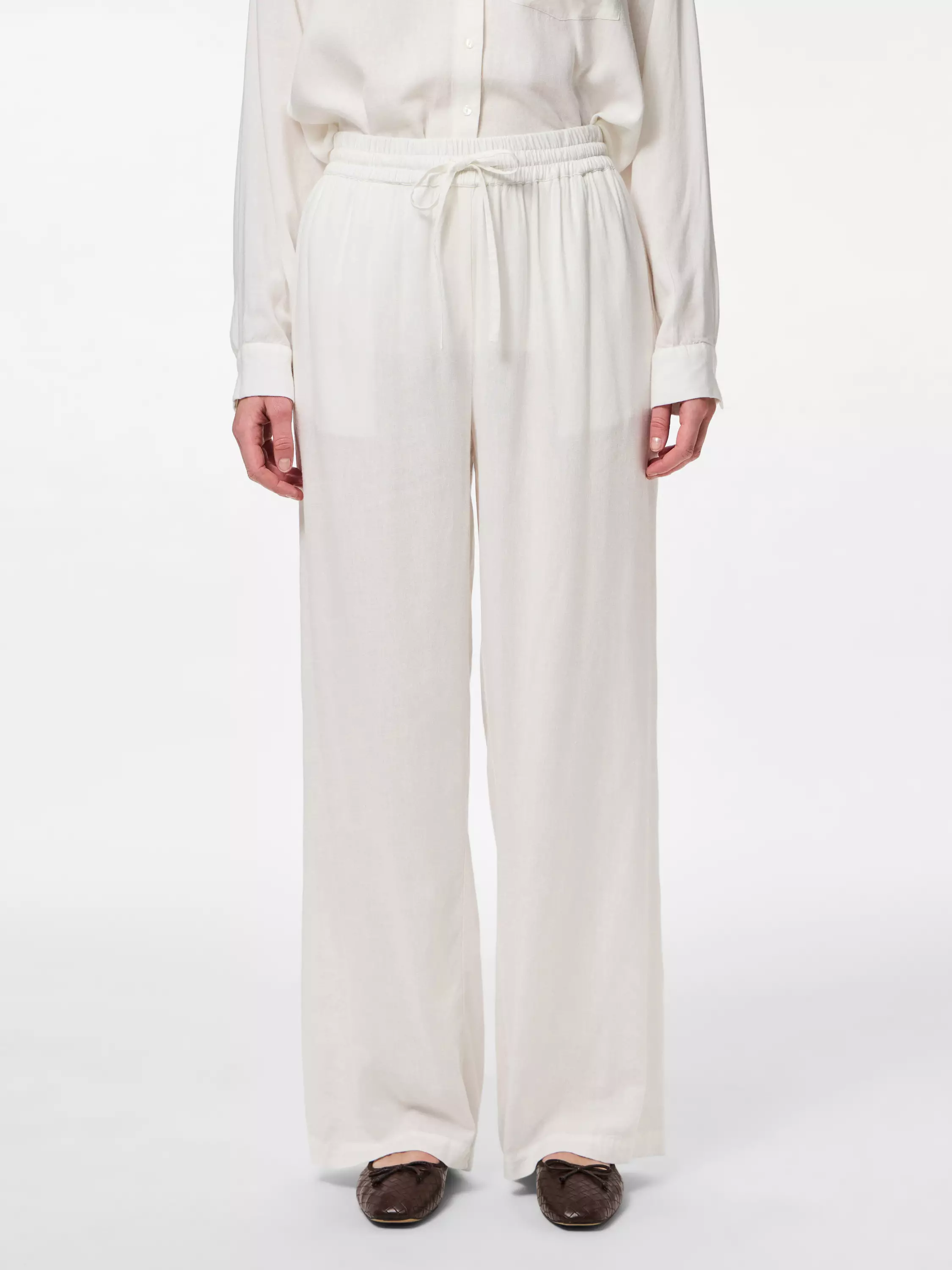 Korkeavyötäröiset leveät housut, joissa on joustava vyötärö ja kiristysnaru.Housuissa on sivutaskut.