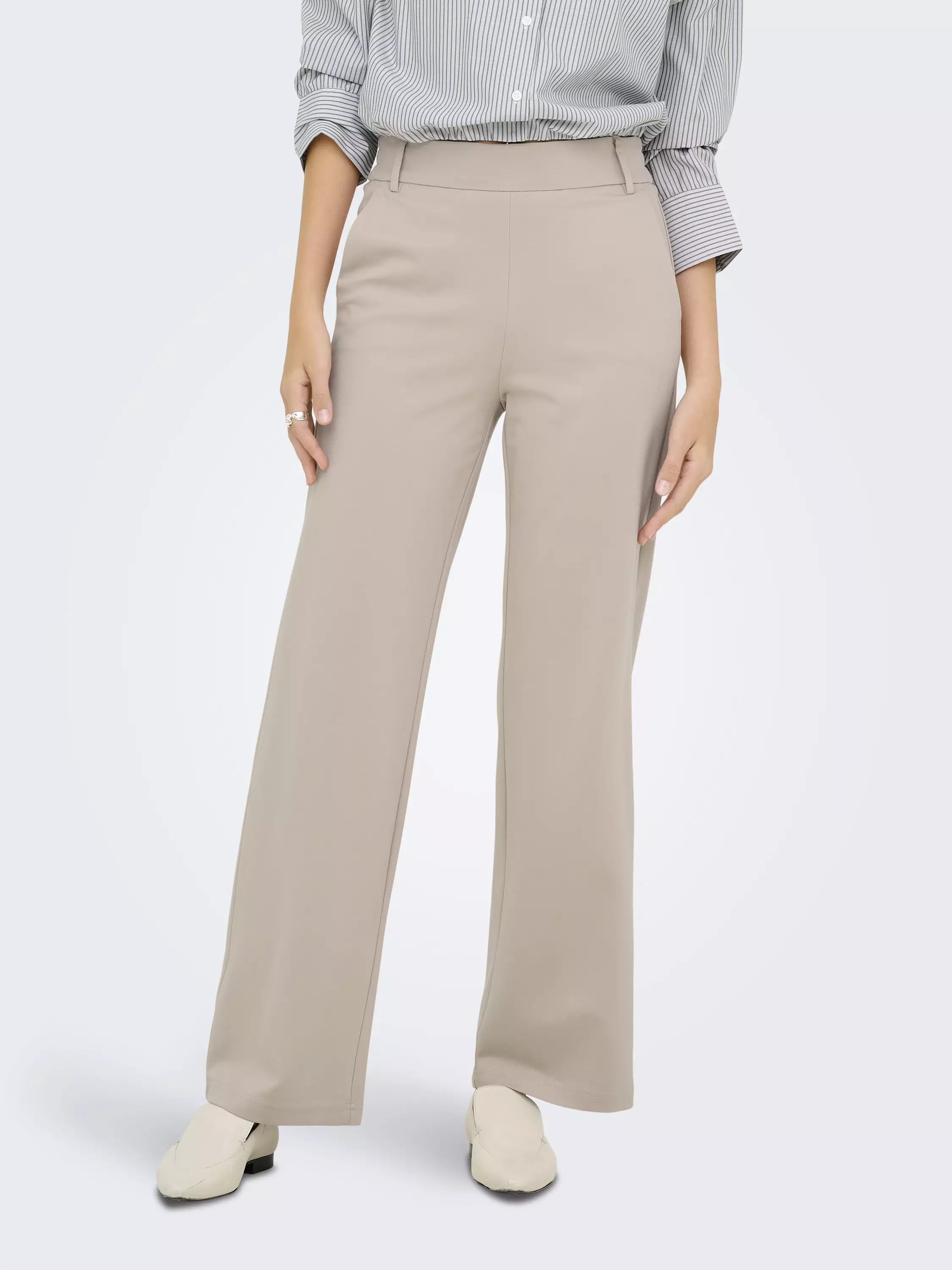 Suorat erittäin joustavat housut, joissa on medium vyötärönkorkeus. Housuissa on sivutaskut sekä vyönlenkit. Housuissa on joustava vyötärö.