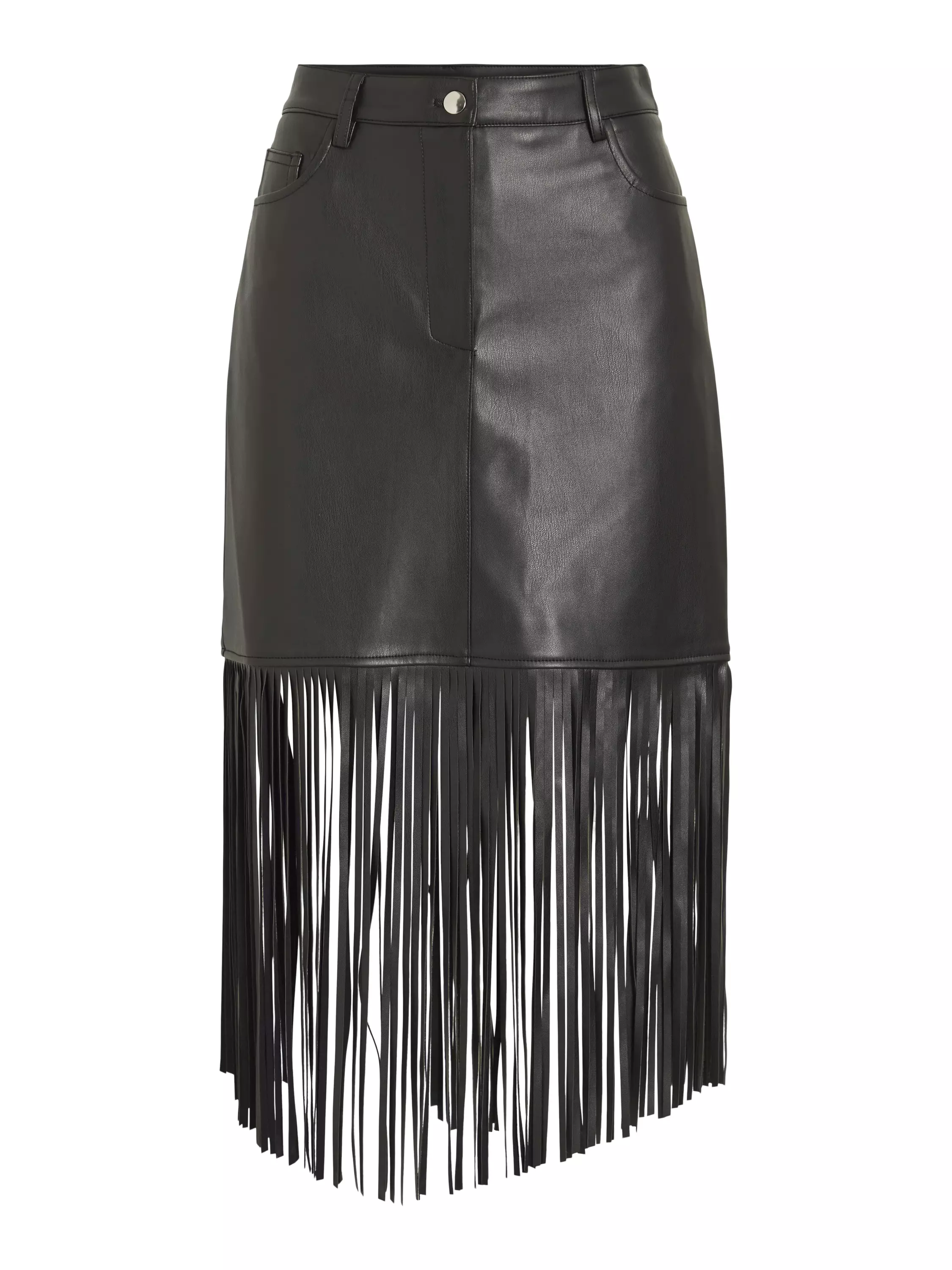 Midi-mittainen keinonahkahame, jossa on helmassa hapsut. Hameessa on vetoketjukiinnitys ja takana on taskut.