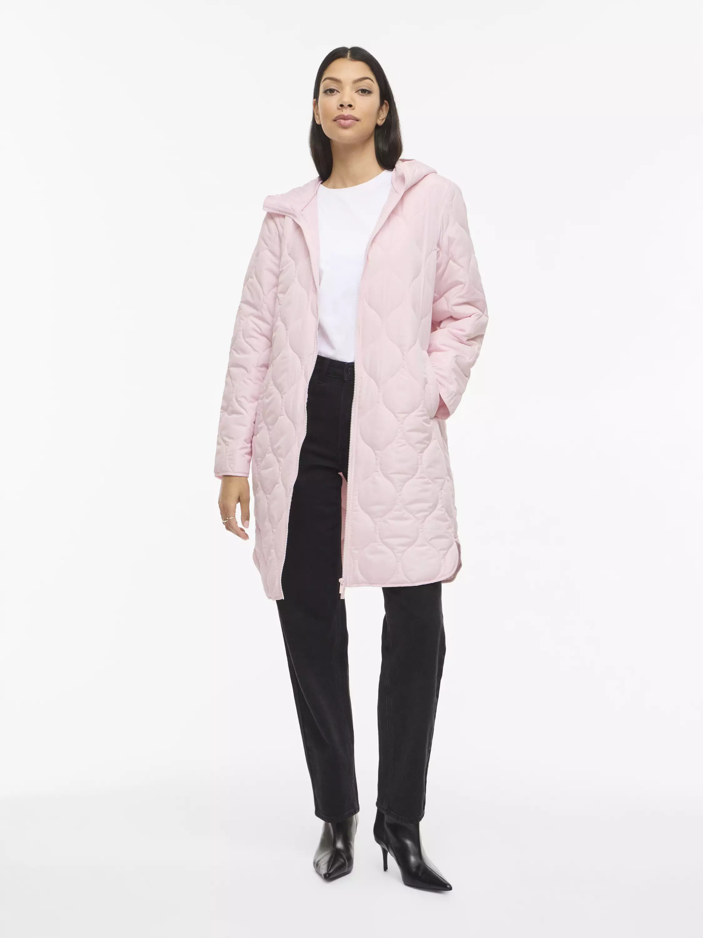 Hupullinen puolipitkä kevytvanutakki. Takissa on avotaskut ja vetoketjukiinnitys.