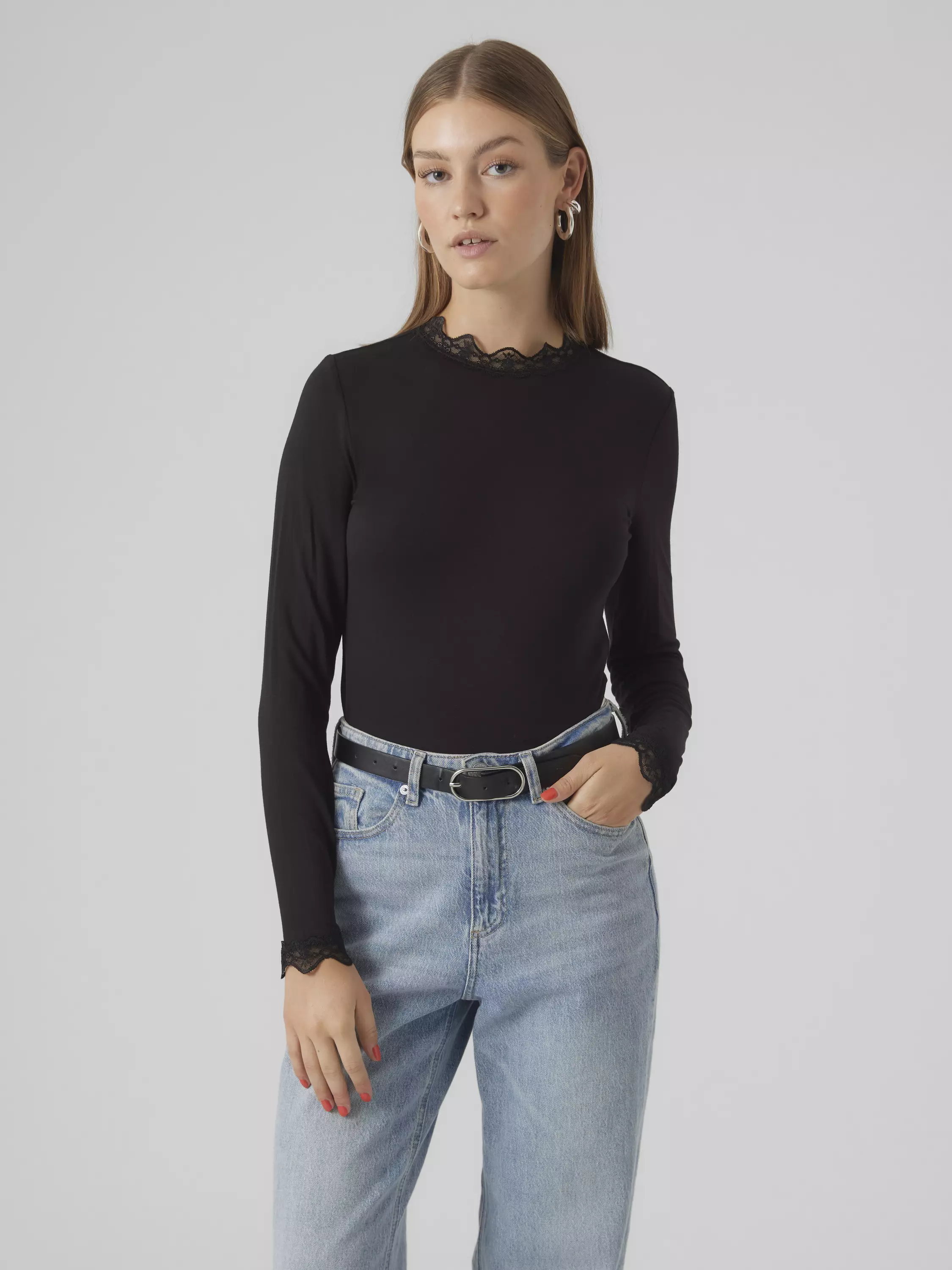 Kaunis korkeakauluksinen paita, jossa on kauluksessa ja hihansuissa pitsireunukset.