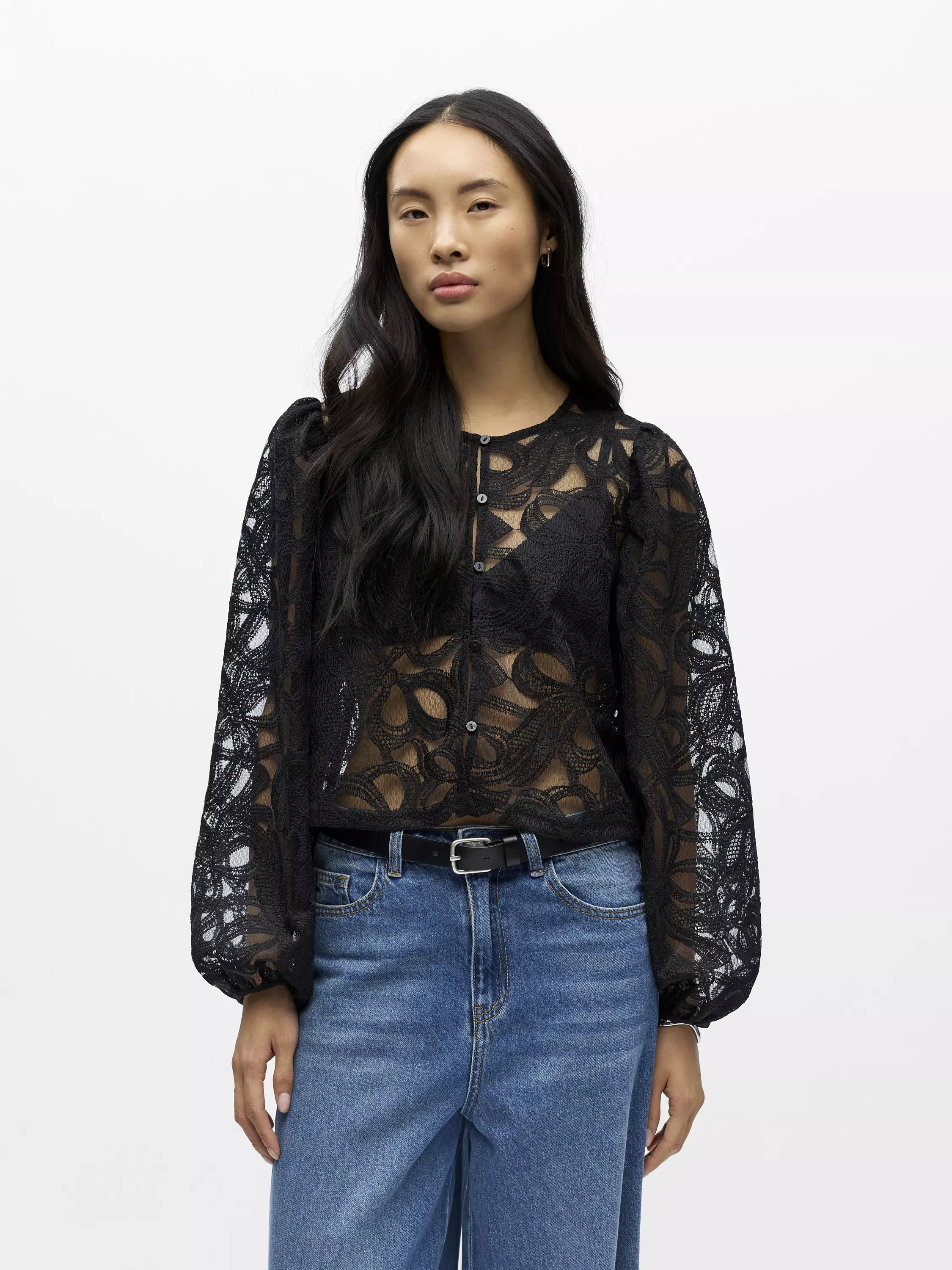 Pitkähihainen paita, jossa on läpikuultava materiaali ja kauniita kirjailtuja kukkasia. Paidassa on kauniit puffihihta ja edessä on nappikiinnitys.