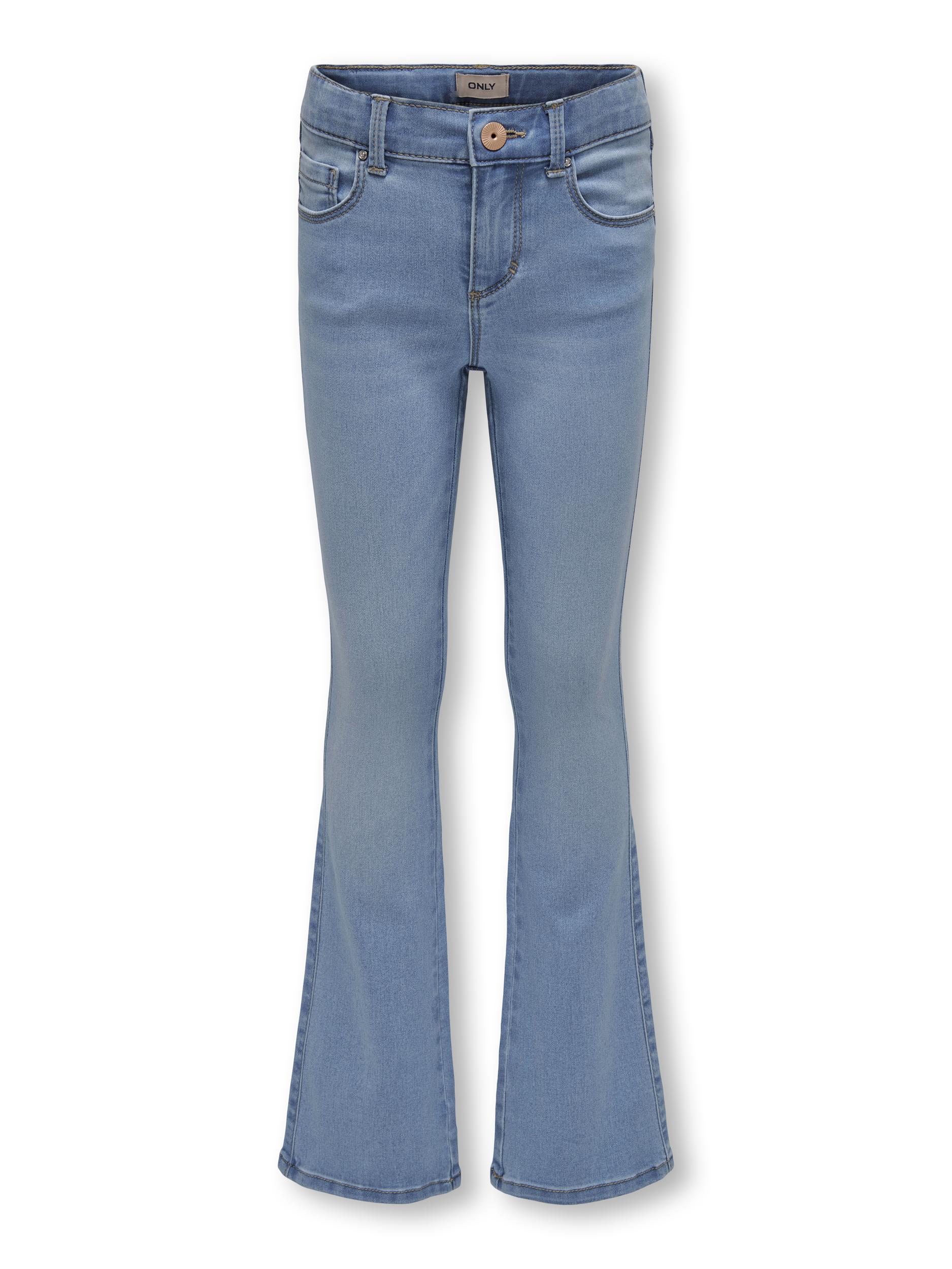 Normaalivyötäröiset joustavat farkut, joissa on leveät bootcut-lahkeet. Vyötäröllä kuminauhasäätö.