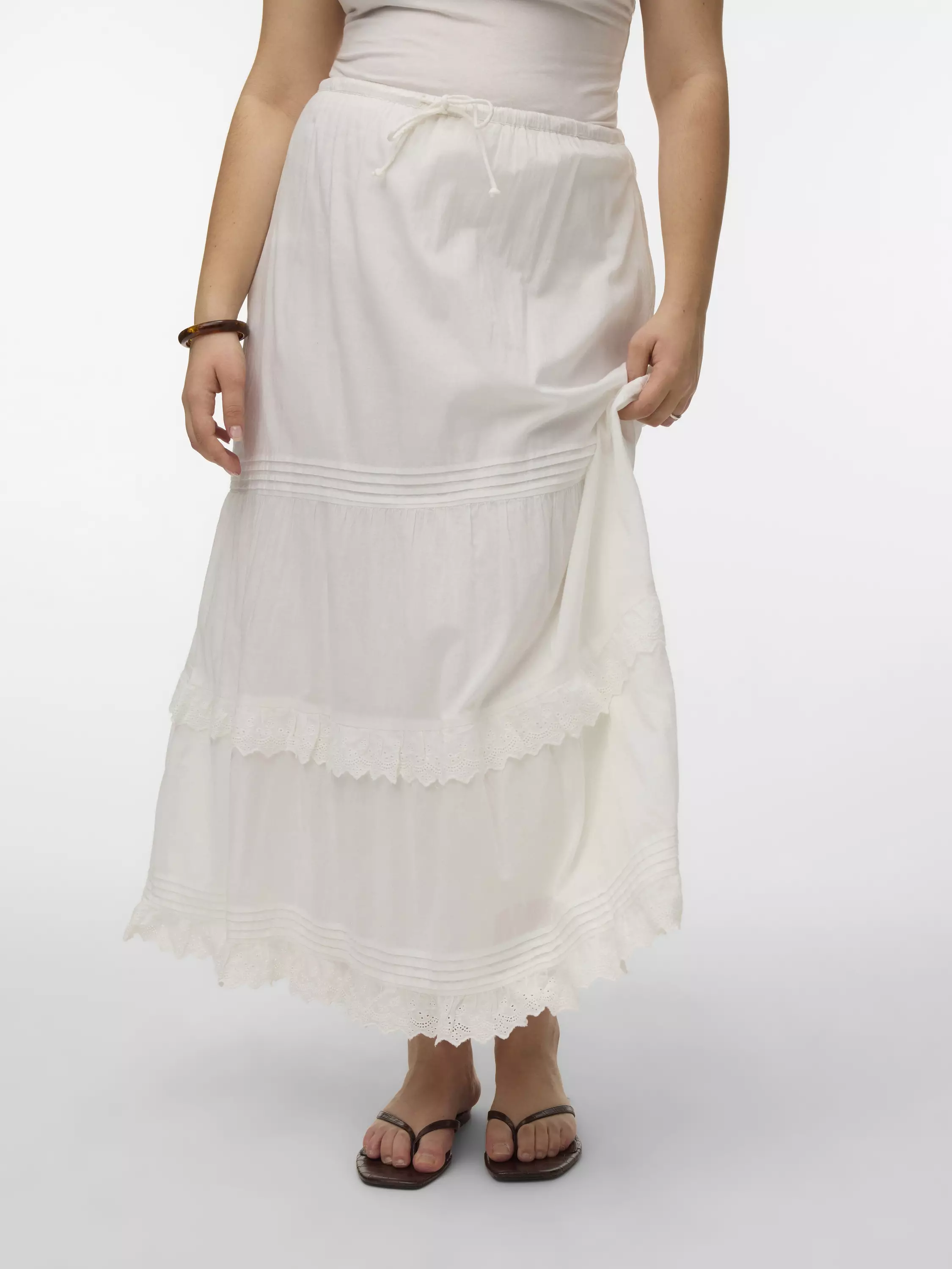 Nilkkamittainen vuorillinen hame, jossa on kauniita yksityiskohtia ja vyötäröllä on kiristysnaru.