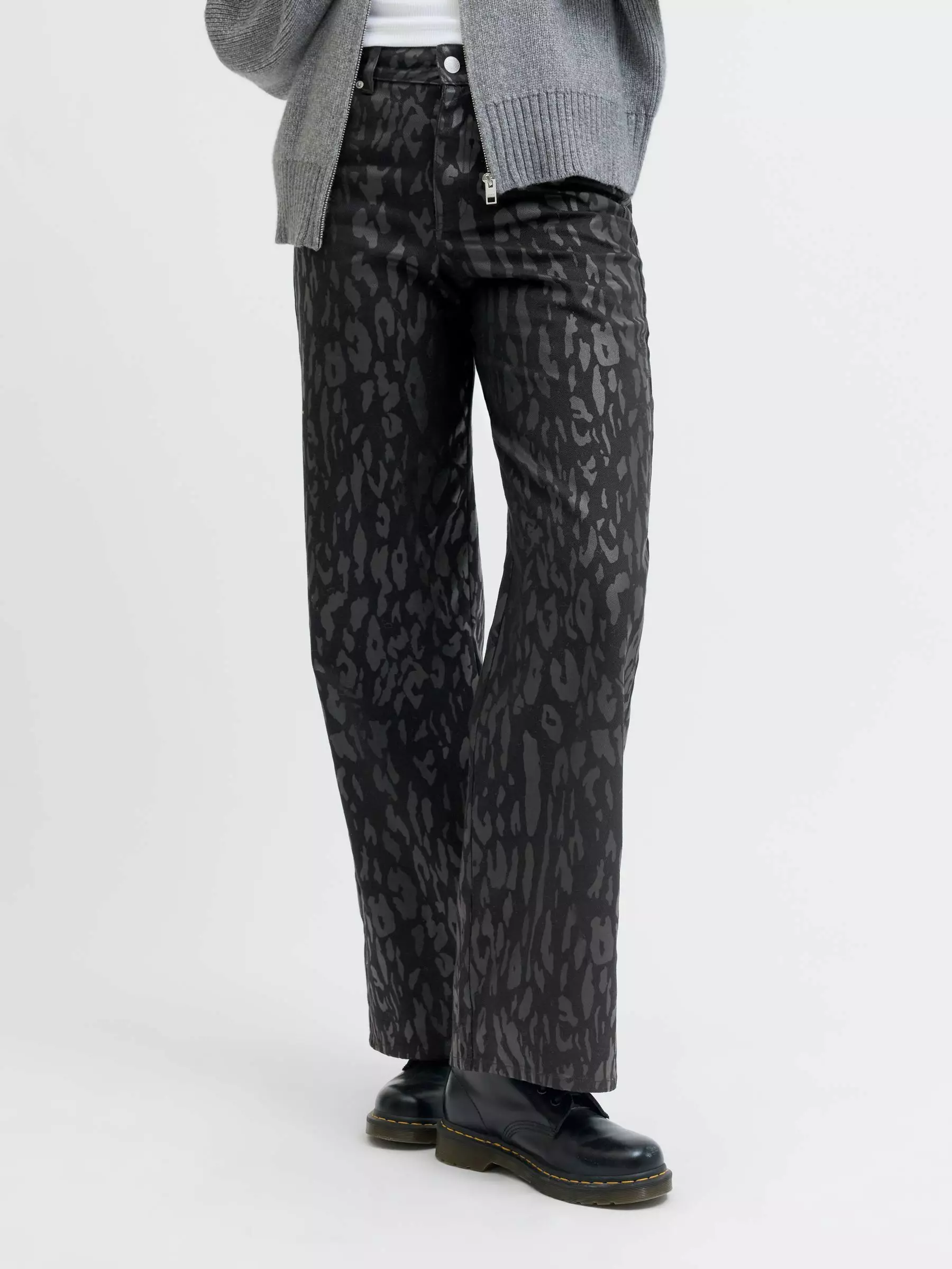 Leveälahkeiset ja korkeavyötäröiset farkut, joissa on kaunis leopardikuvioitu pinnoite.