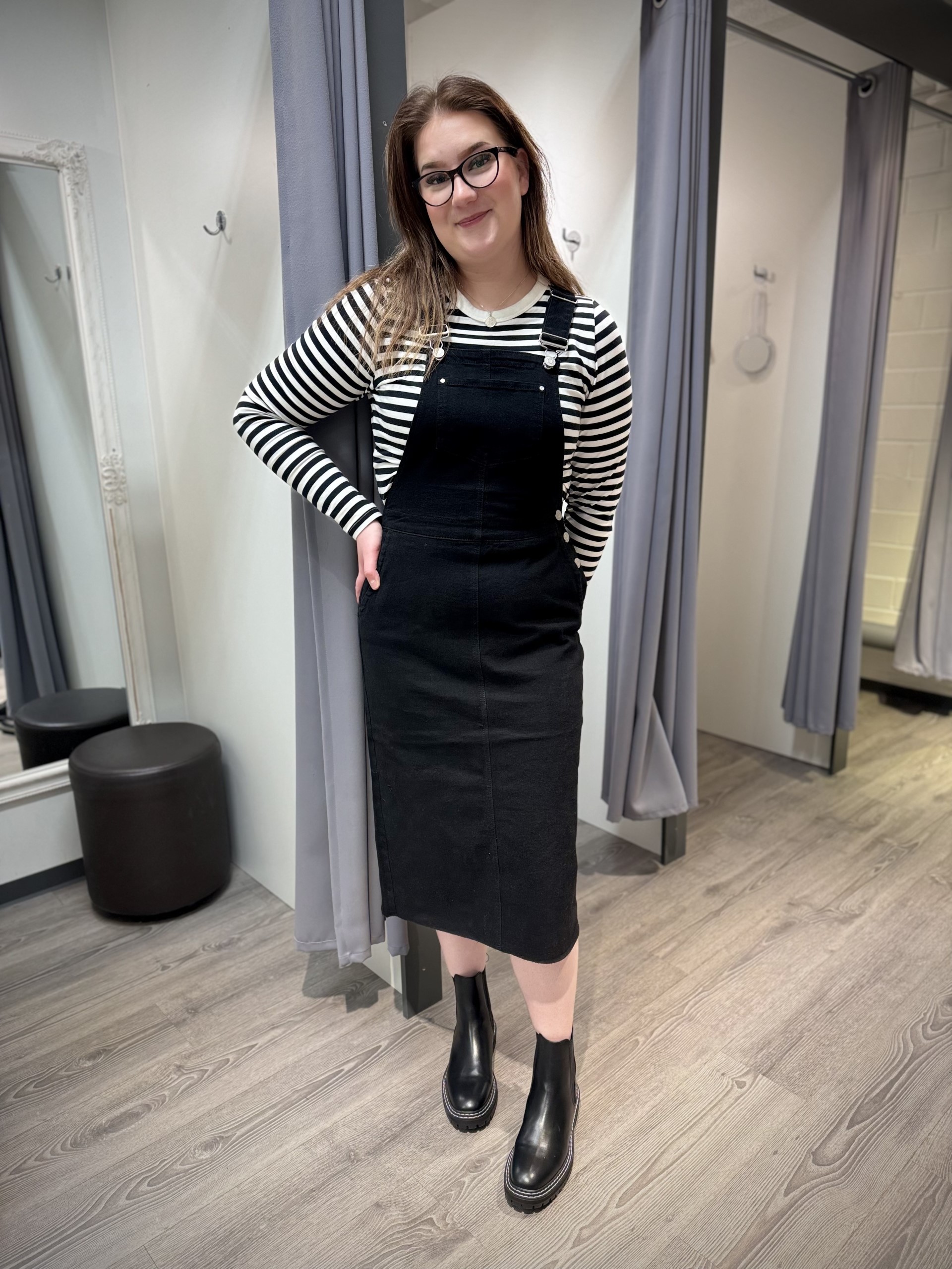 Pitkä lappumekko, joka on joustavaa denimiä. Edessä on rintasku sekä kaksi avotaskua. Helman vasemmalla puolella on nappikiinnitys ja takana on halkio. Helma on päättelemätön.