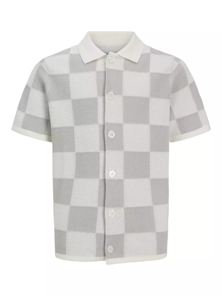 Lyhythihainen neule, jossa on nappikiinnitys ja kaulukset.