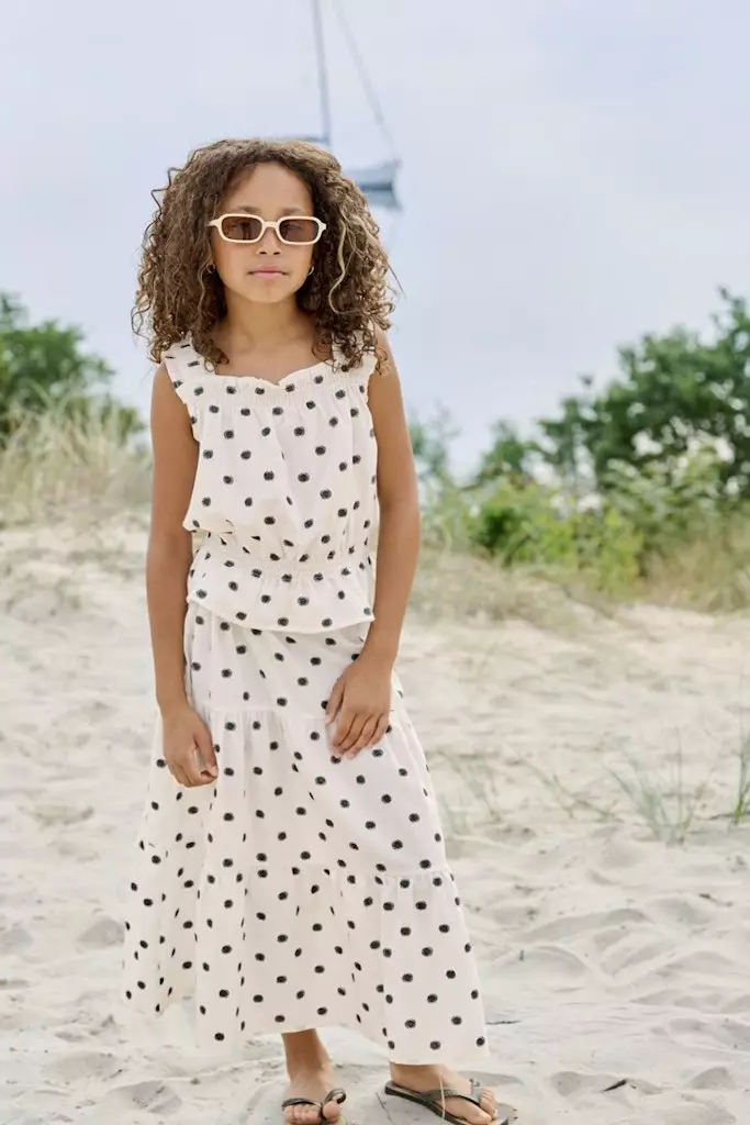 Kaunis pallokuosinen vuorillinen hame, jossa on joustava kuminauhavyötärö. Vyötäröllä on kiristysmahdollisuus.