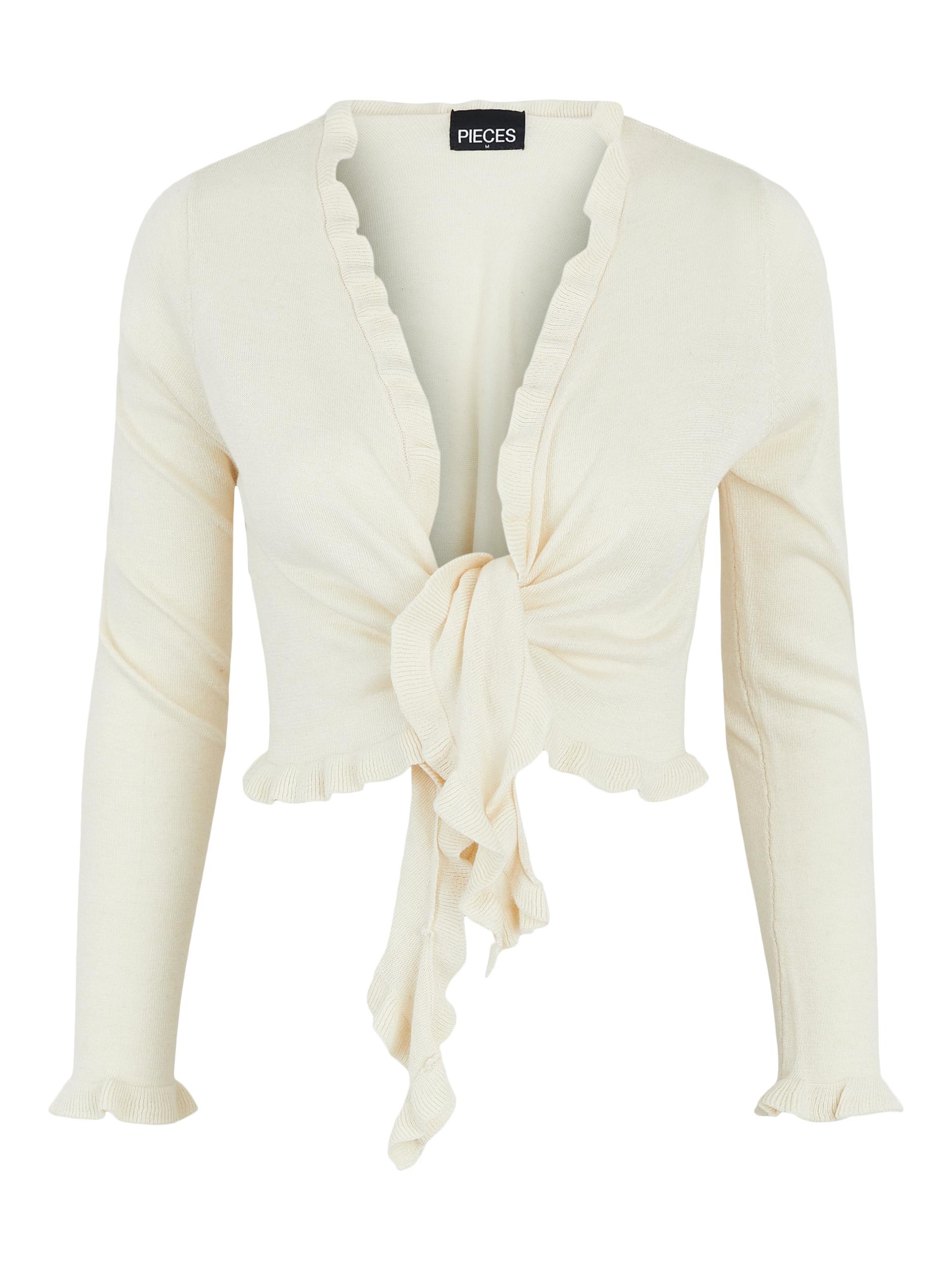 Cropped -mallinen edestä solmittava neuletakki, kauniit röyhelöyksityiskohdat.
