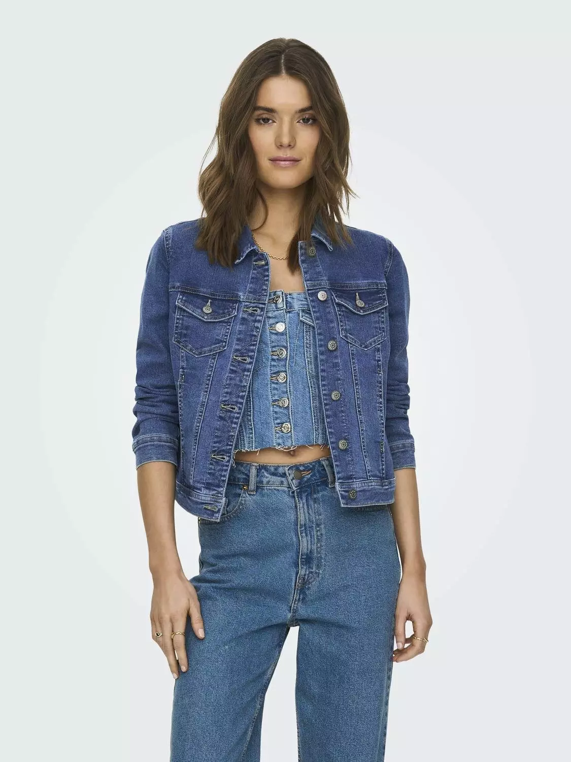 Farkkutakki, jossa on edessä nappikiinnitys sekä kaksi napillista rintatasku. Kangas on joustavaa materiaalia.