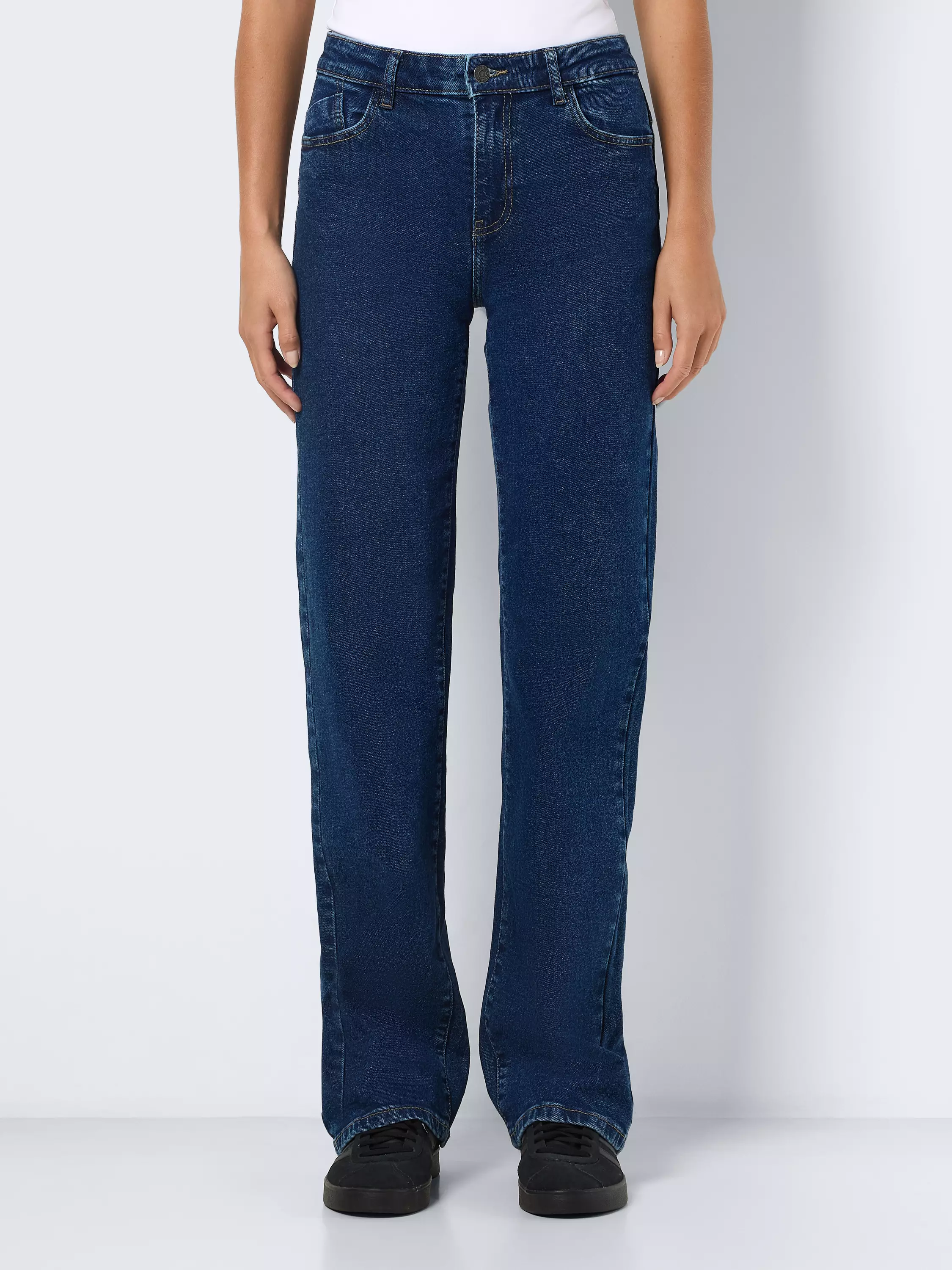 Leveälahkeiset joustavat farkut, joissa on kaunis tummansininen pesu ja normaali vyötärön korkeus.